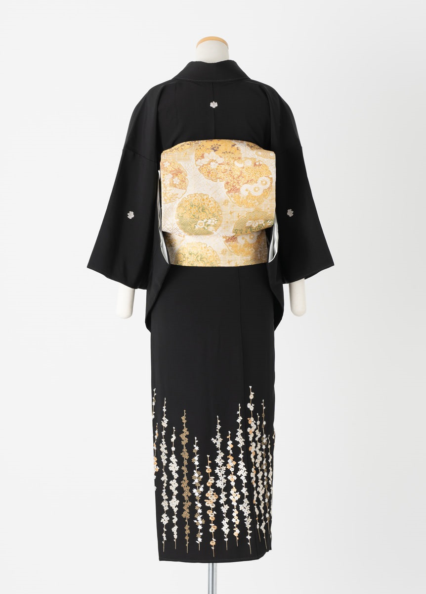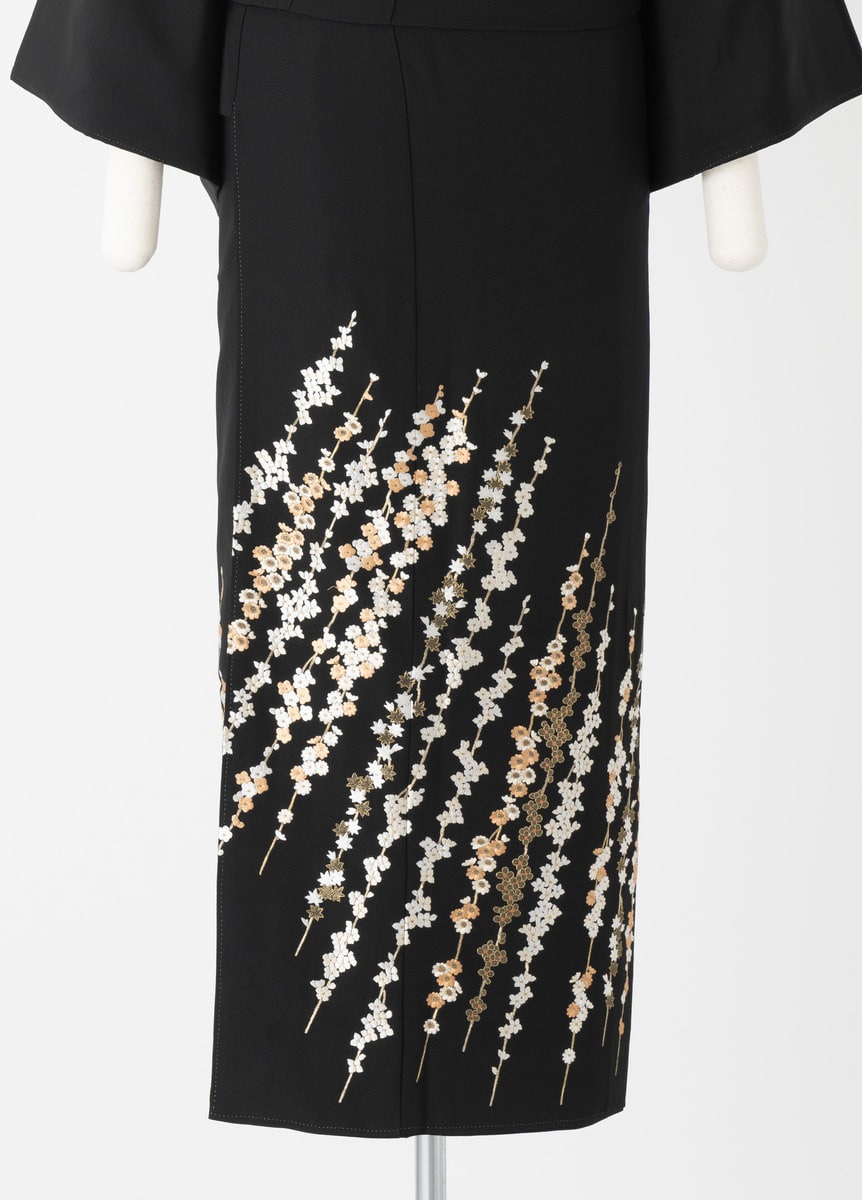蘇州刺繍をふんだんに使用した小花柄の黒留袖です。蘇州刺繍とは中国三大刺繍の一つで、毛髪よりも細い糸を用いた絵画のような繊細な美しさが特徴です。
