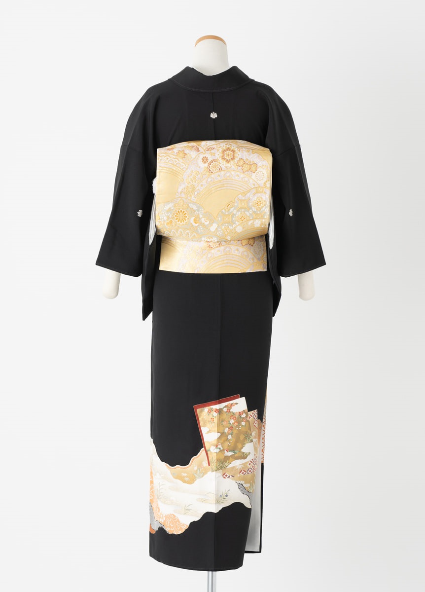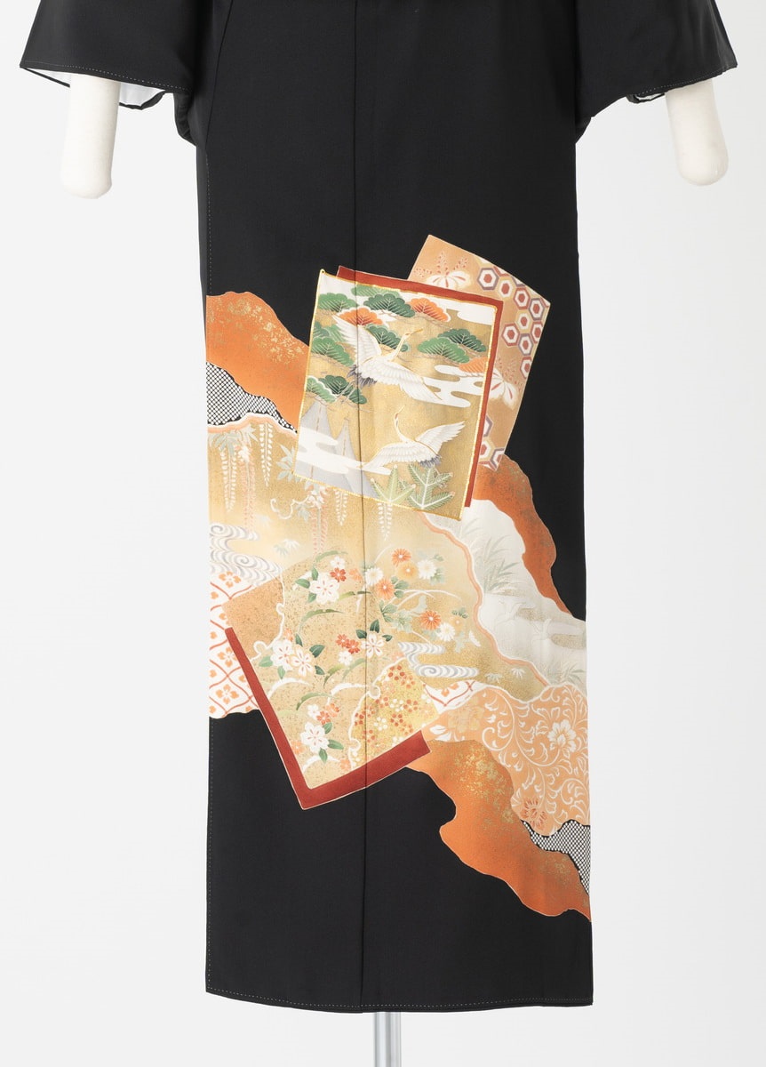 色紙に描かれた鶴が印象的な黒留袖です。四季の花々も描かれているため、季節を問わずに通年お召いただけます。金と朱色の組み合わせが、お祝いの席を華やかに彩ります。