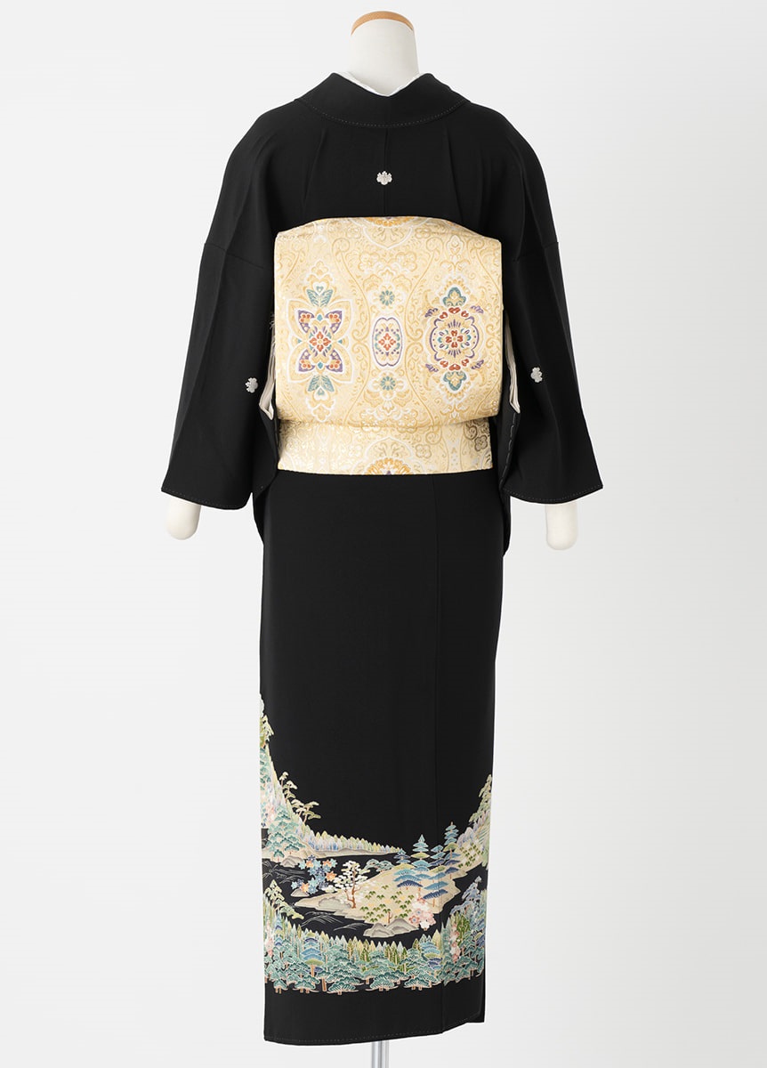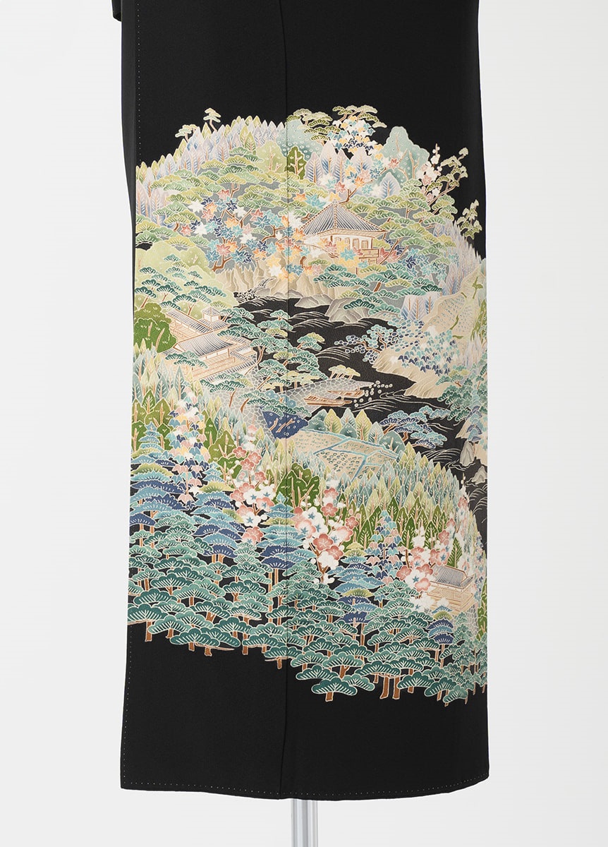 美しく描かれた山水画の黒留袖です。たっぷりと描かれた柄は、金銀を使わずとも華やかさを演出します。