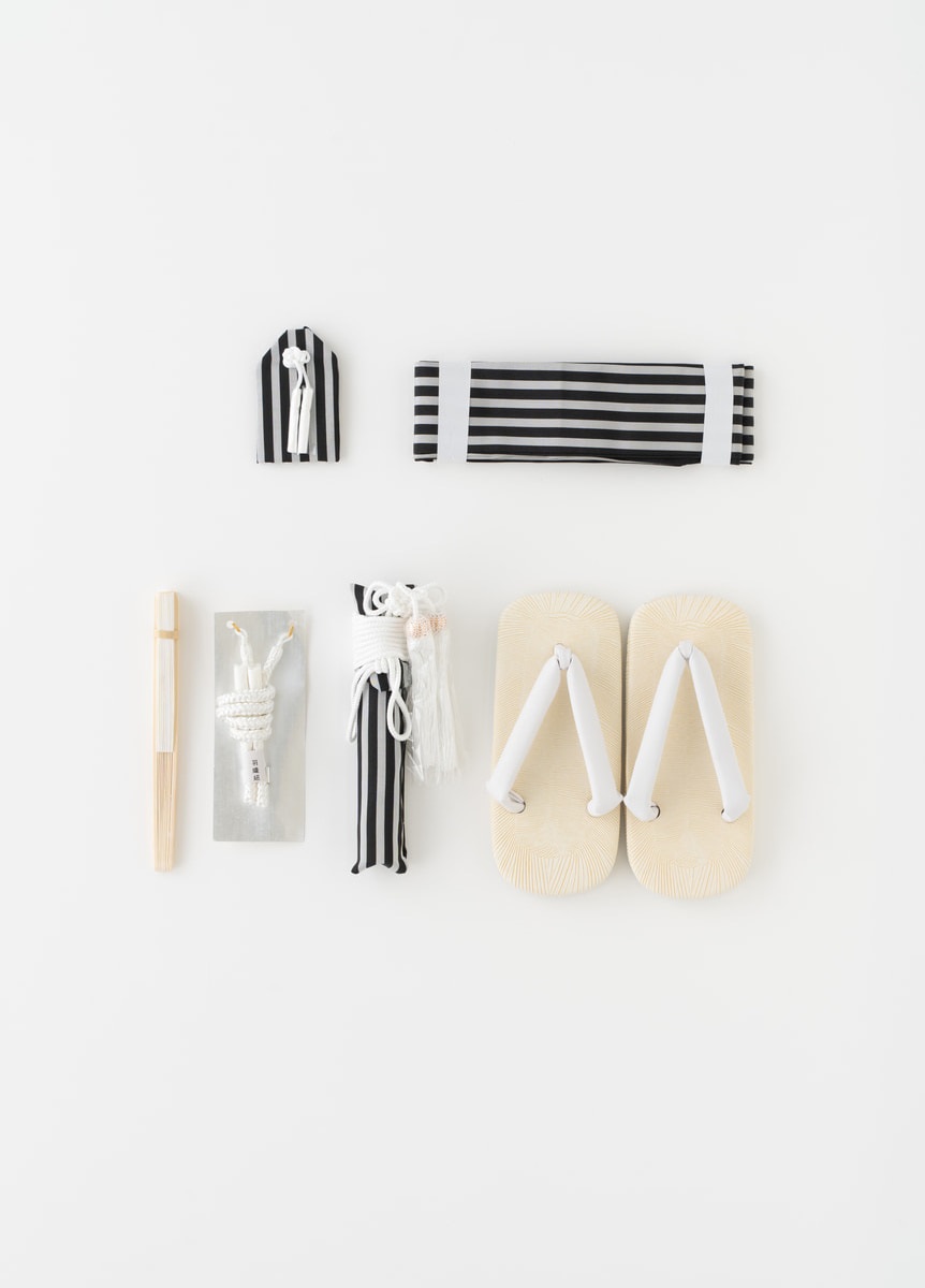 羽織、きもの、長襦袢、袴、角帯、雪駄、懐剣、扇子、羽織紐、お守り袋の10点セット。