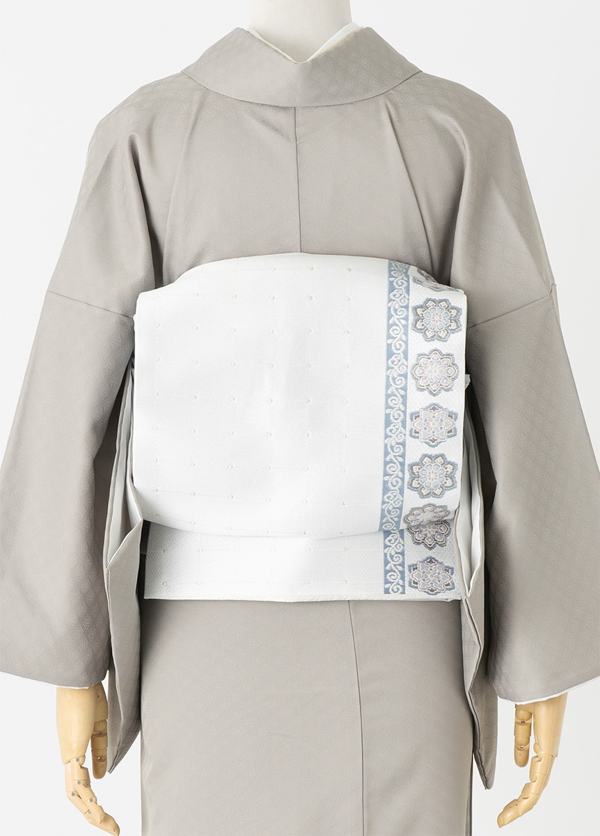 スタイリッシュな灰色の付下げ訪問着に、白の袋帯を合わせました。モノトーン調の明るいコーディネートをお探しの方におすすめです。