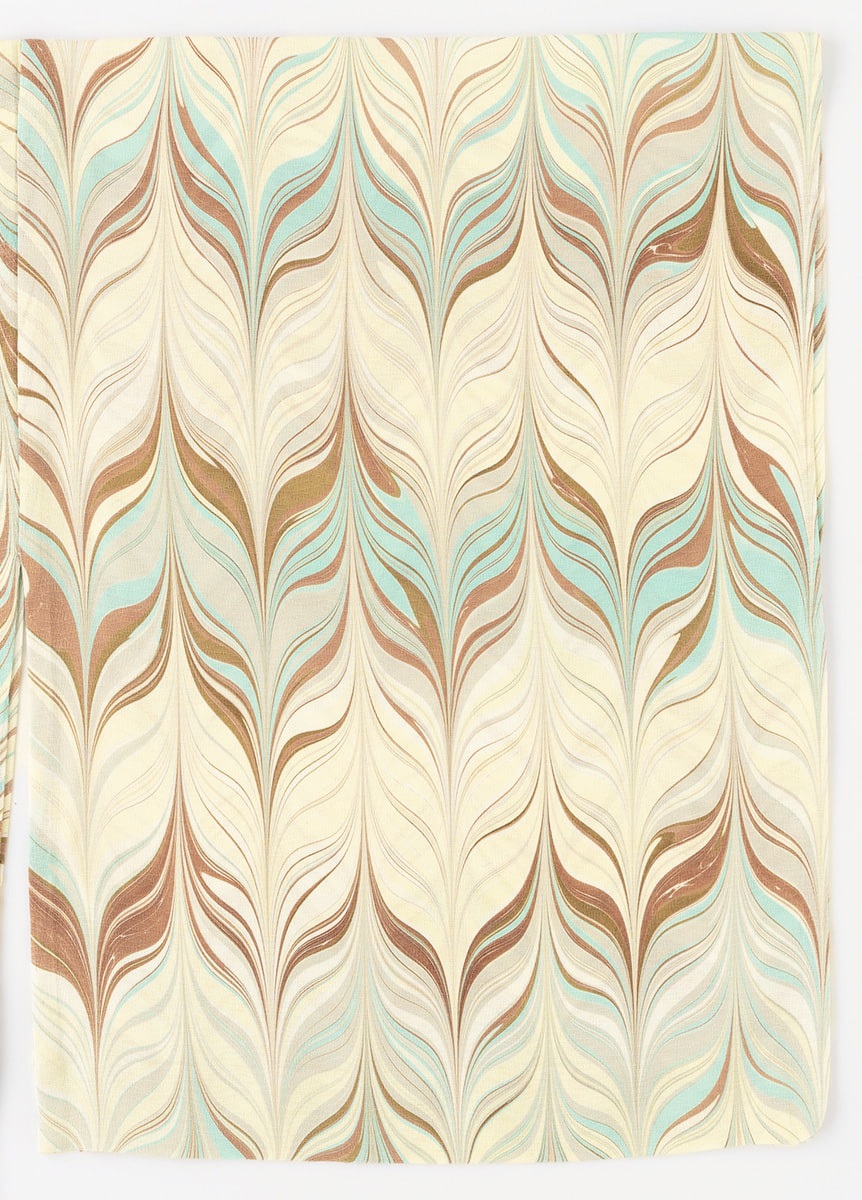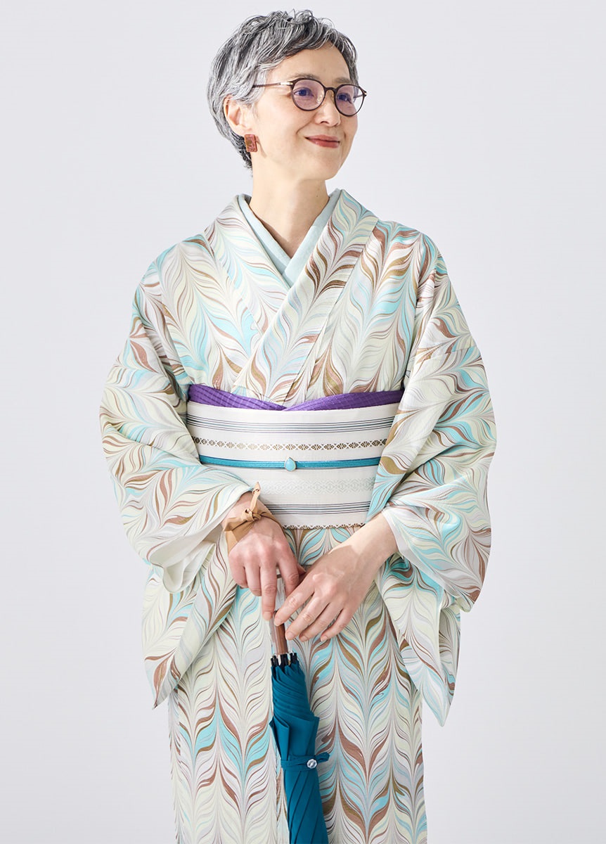 夏素材の「紗」。地模様は細かな波模様が織り込まれ、墨流しの羽根模様が美しく映えます。羽根が一枚ずつ重なるような全体柄は、茶をアクセントに爽やかな配色で仕上げました。白や青など清涼感のある小物合わせがおすすめです。単衣の時期~盛夏にご着用ください。
