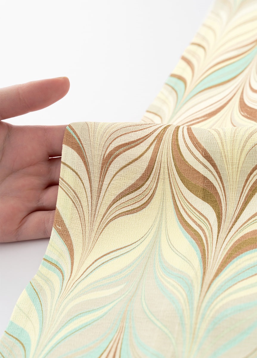 墨流しとは、水面に染料を流し、生地に写し取る染め技術。ランダムな動きや色の混ざり具合などは一反一反異なり、やわらかな曲線表現で唯一無二のデザインに仕上がります。また、「苦労(黒)を水に流す」として大変縁起の良い意味も持ちます。