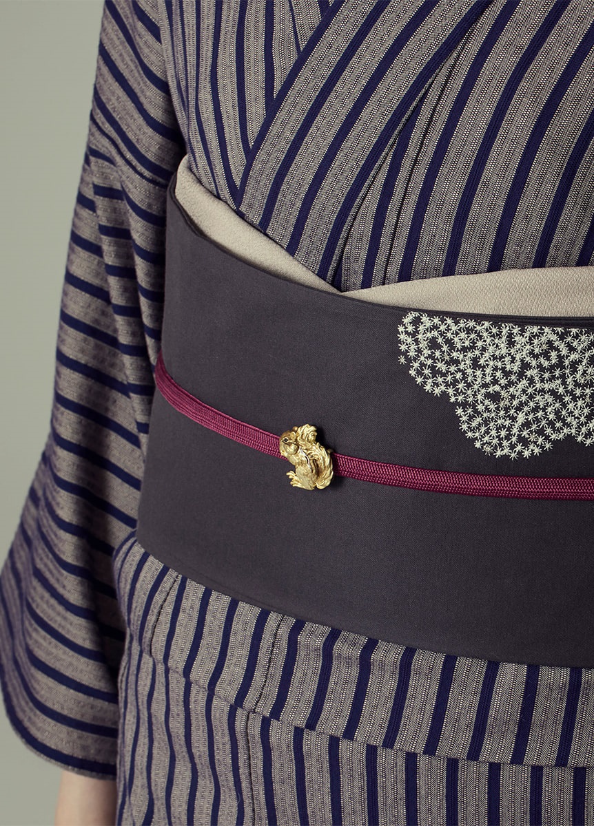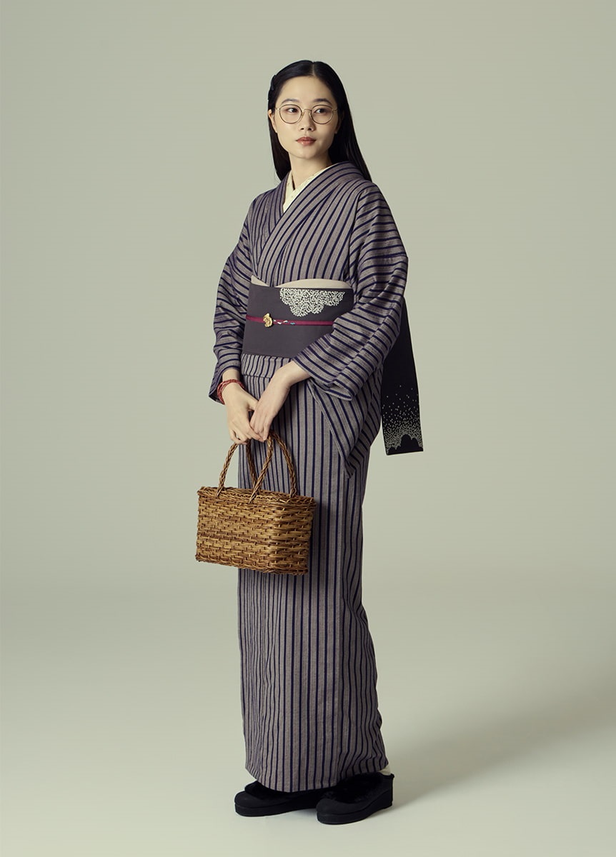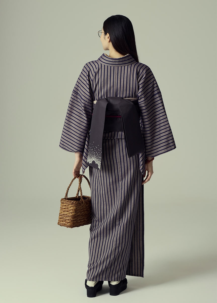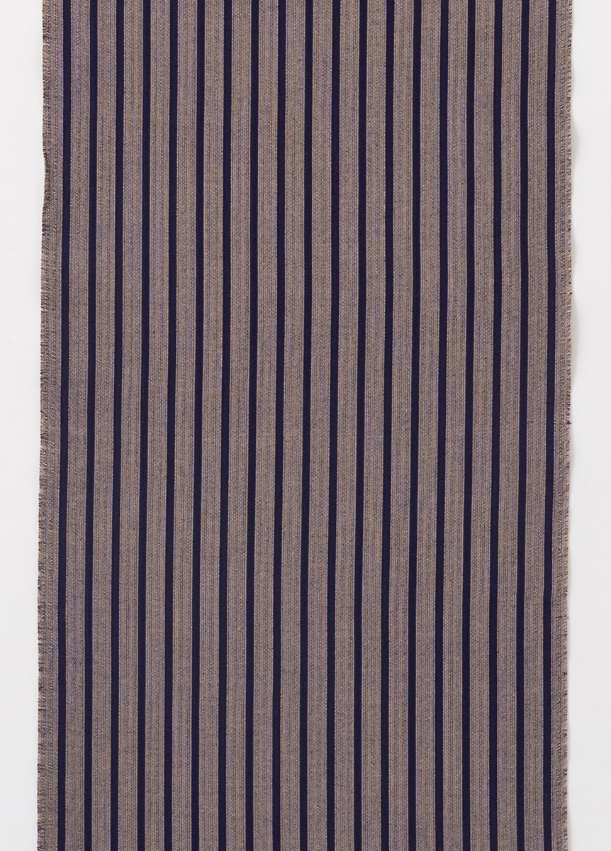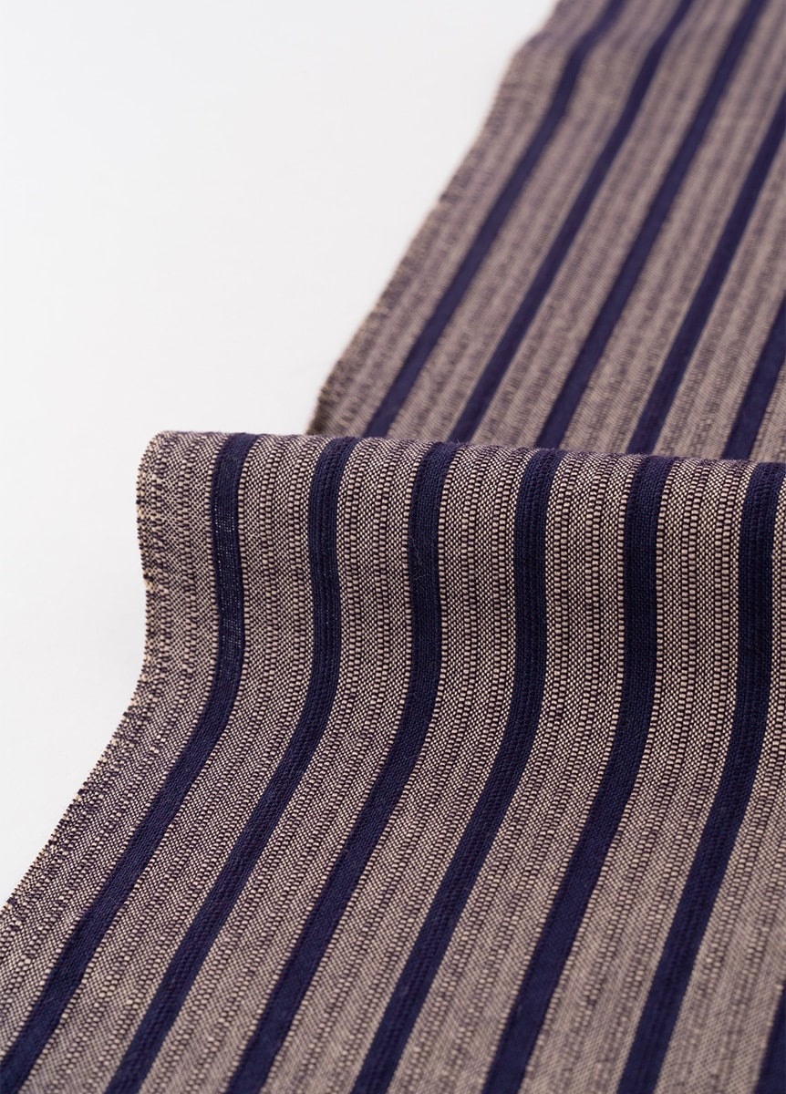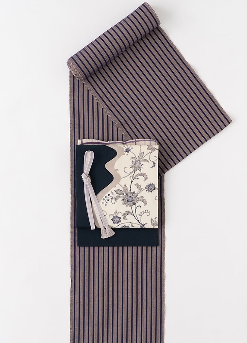 ベージュ地に茄子紺の縞柄ですっきりとした印象に。仕立てた際のバランスを考え、縞の太さを調整しました。アンティークの柄物の帯なども相性がが良い、シンプルなデザインです。