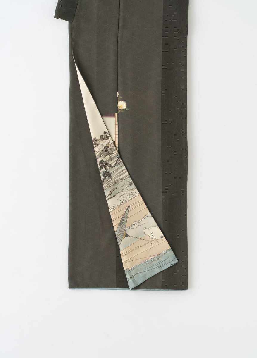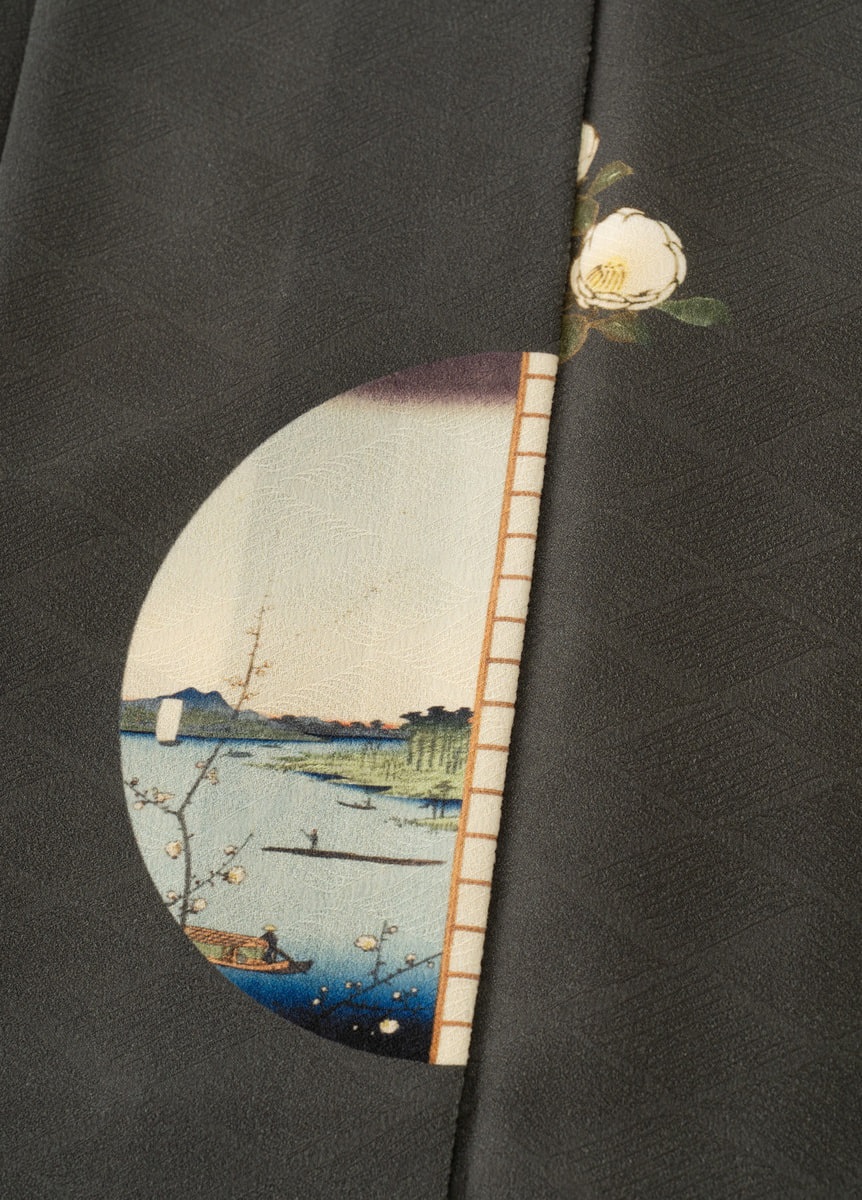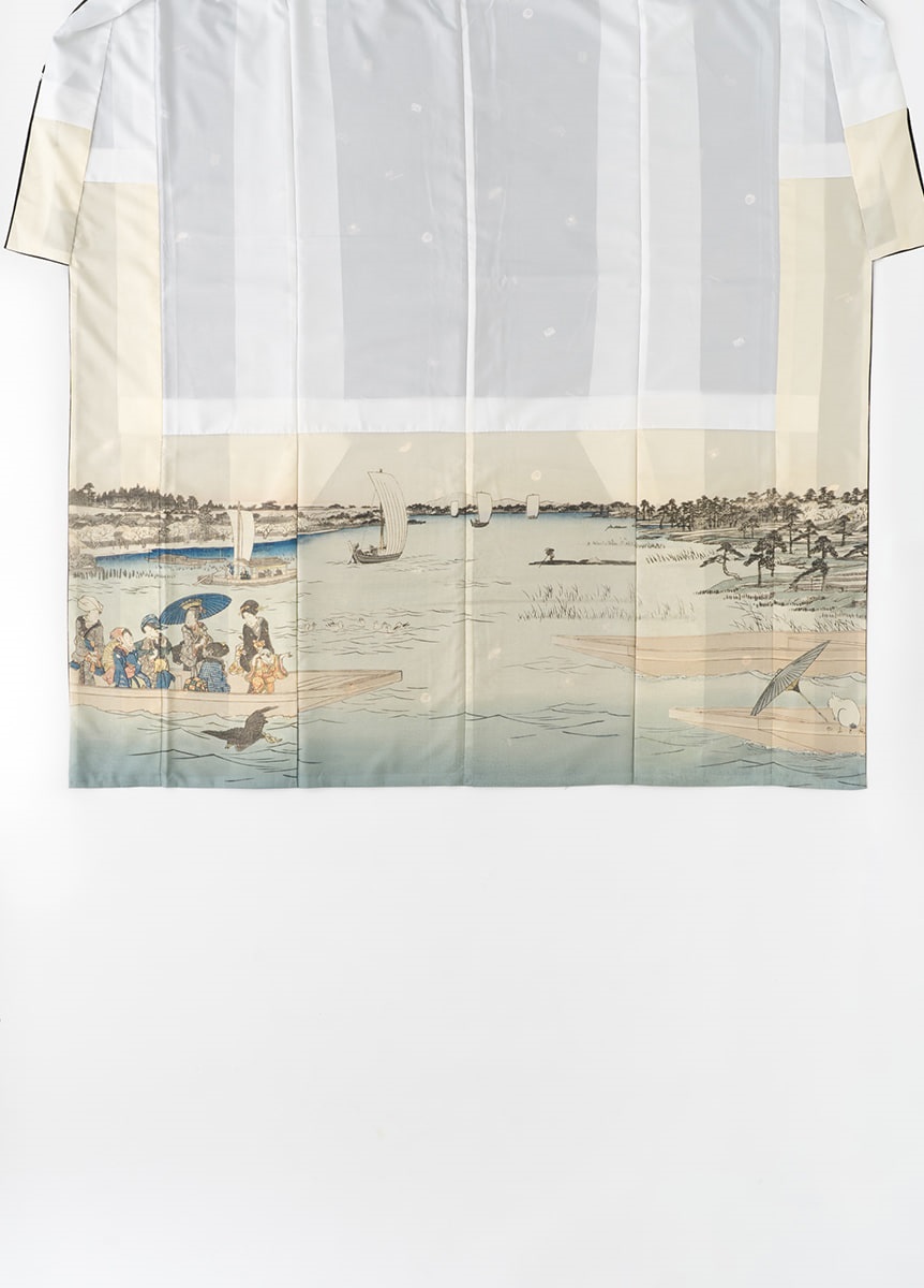 歌川広重の浮世絵をきもの柄として表現した一着。表地の浮世絵は、真崎という土地の料亭から見える景色を描いた図。窓外には、隅田川が広がり、奥には筑波山が見えます。梅と椿の花から冬の季節が伺えます。グレー地のシックな印象に、江戸時代の情緒を重ねたデザイン。八掛には、窓外の隅田川の景色を描いた浮世絵をアレンジしたデザインをつけています。広重が描いた猫を忍ばせ“ 猫の旅” を裏テーマに遊び心をプラス。