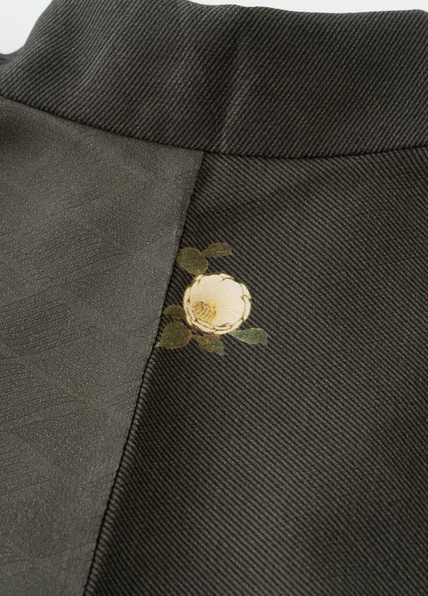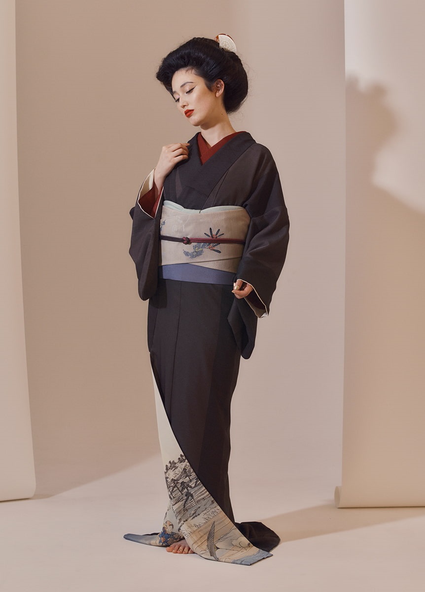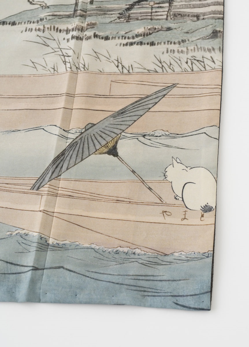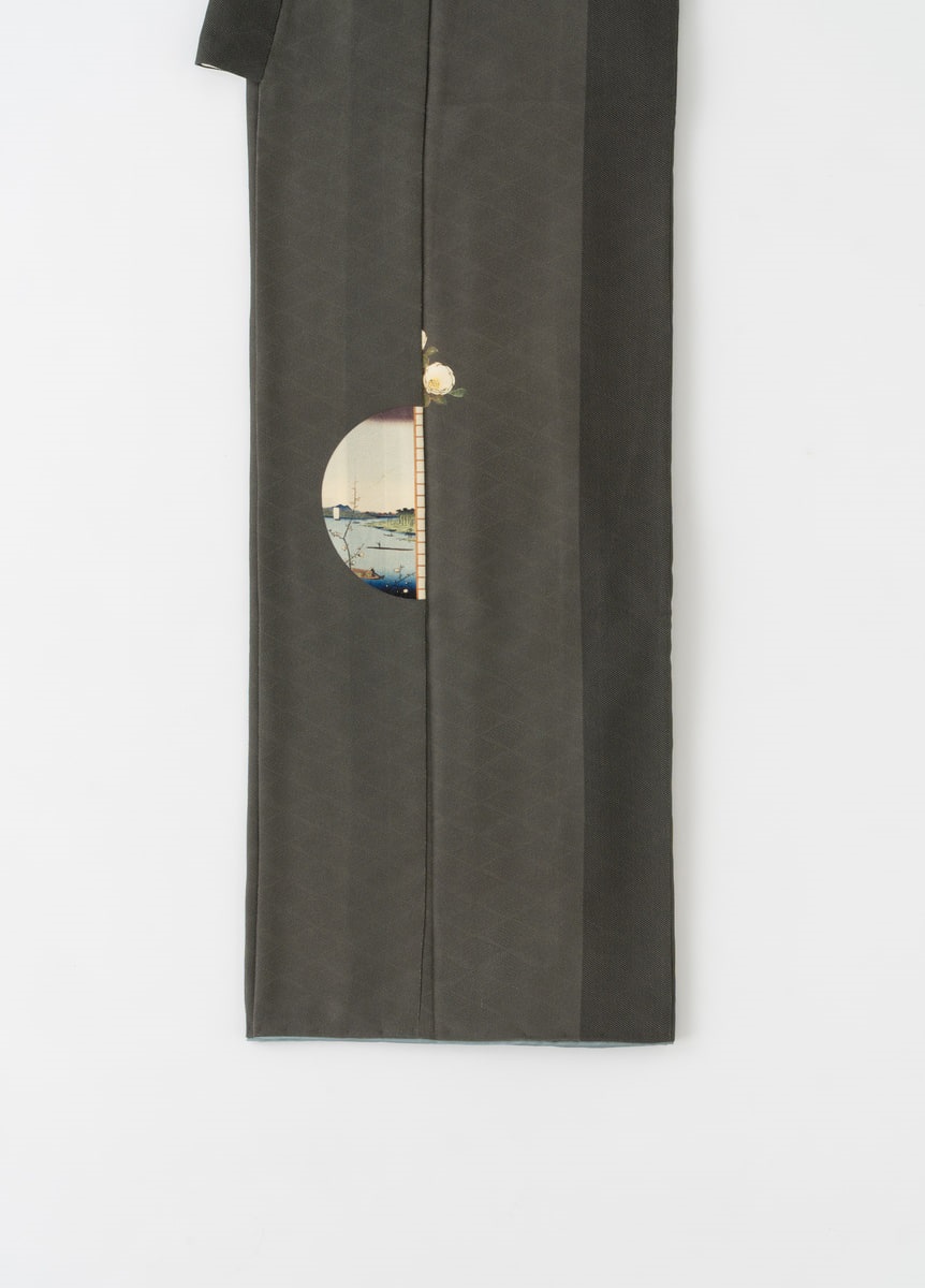 歌川広重の浮世絵をきもの柄として表現した一着。表地の浮世絵は、真崎という土地の料亭から見える景色を描いた図。窓外には、隅田川が広がり、奥には筑波山が見えます。梅と椿の花から冬の季節が伺えます。グレー地のシックな印象に、江戸時代の情緒を重ねたデザイン。八掛には、窓外の隅田川の景色を描いた浮世絵をアレンジしたデザインをつけています。広重が描いた猫を忍ばせ“ 猫の旅” を裏テーマに遊び心をプラス。