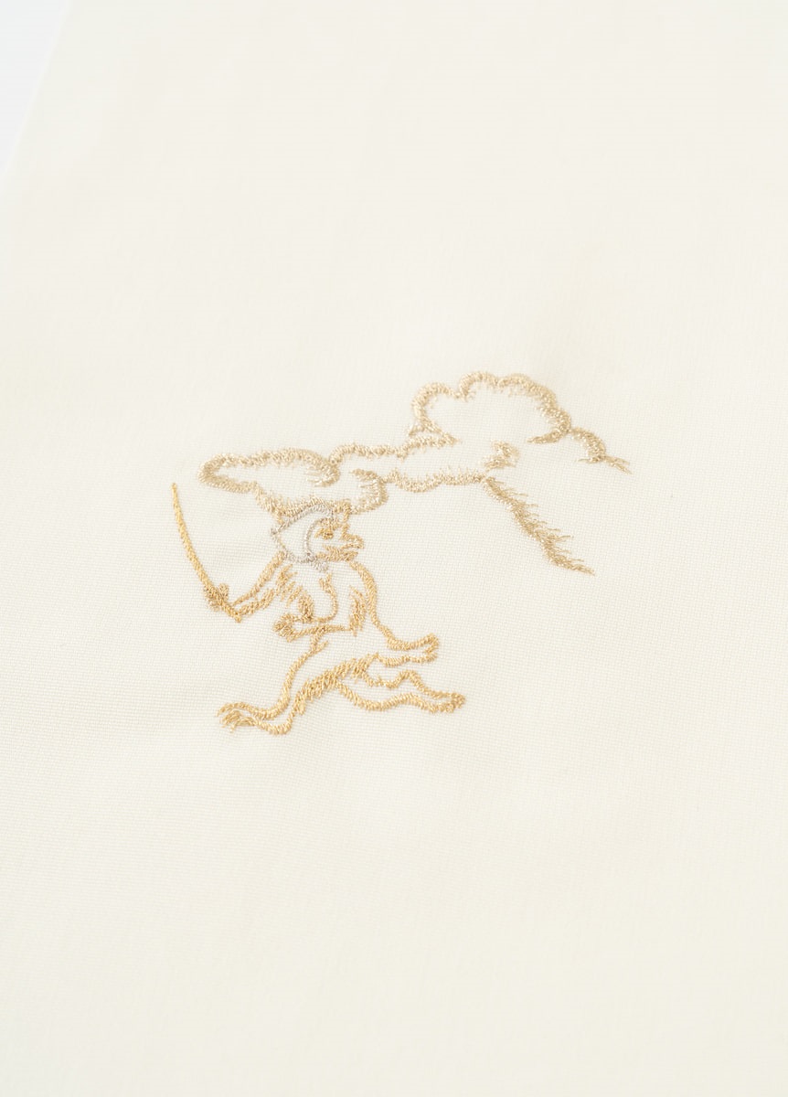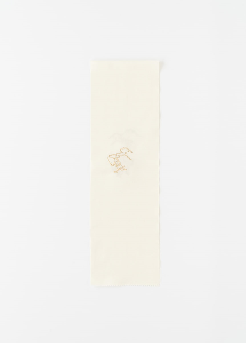 東海道五十三次の場面を切り取り、人を鳥獣戯画に置き換えて表現したデザインの刺繍半衿。江戸時代の遊び心も感じられる1 枚です。白地× 金糸で衿元のアクセントに。