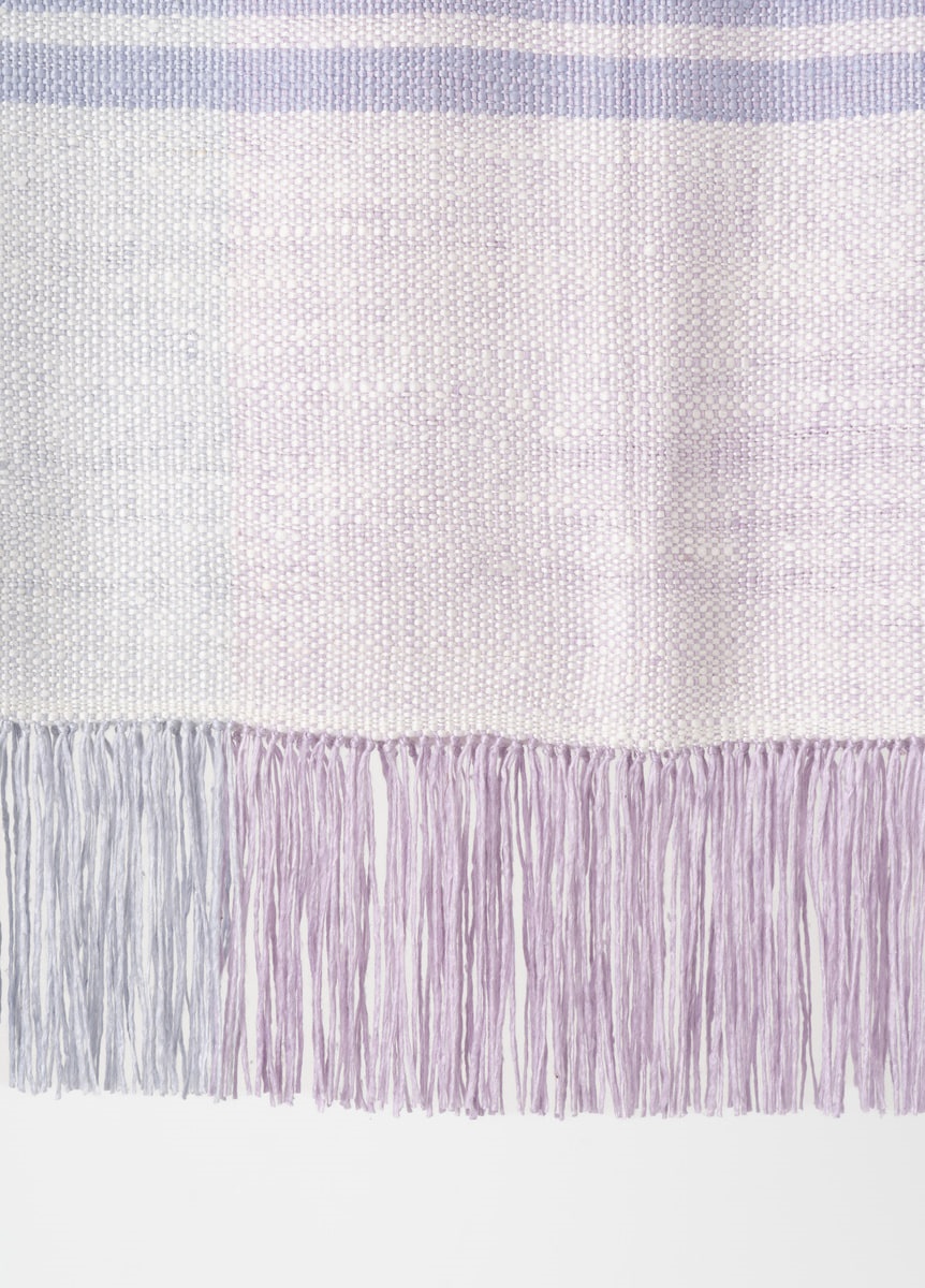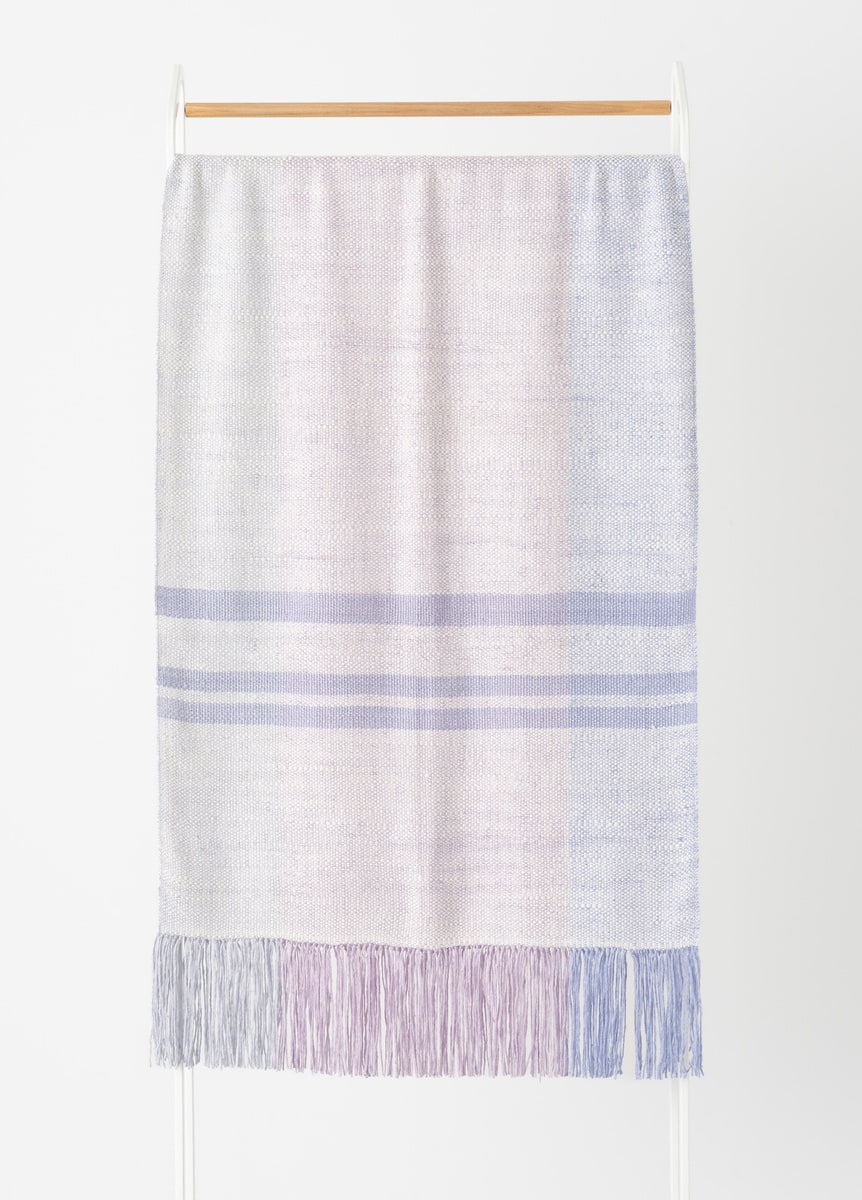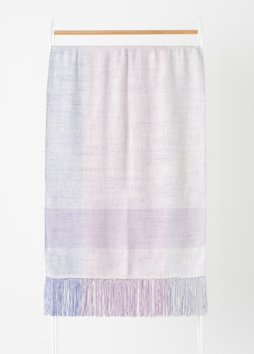 織工さんによって一枚一枚手織りで製作しています。ショールの長さや生地巾を均等に保つ為、一定の力加減を保ちながら、織り進めていきます。緯糸の打ち込み加減をはかりながら織り出す、手織りならではの柔らかな生地感が魅力的なものづくりです。