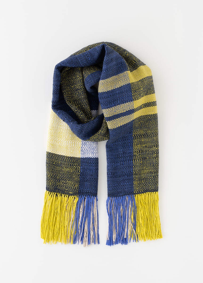 織工さんによって一枚一枚手織りで製作しています。ショールの長さや生地巾を均等に保つ為、一定の力加減を保ちながら、織り進めていきます。緯糸の打ち込み加減をはかりながら織り出す、手織りならではの柔らかな生地感が魅力的なものづくりです。