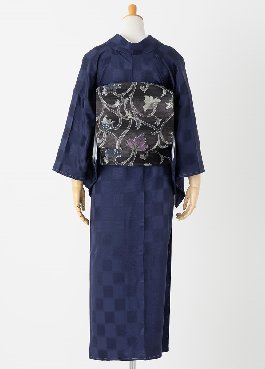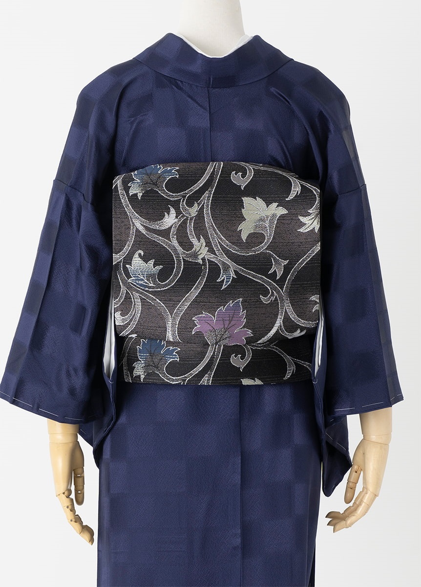 黒地に唐草をデザインした袋帯です。無地に近い着物に合わせることで、大きな唐草が映えるコーディネートです。