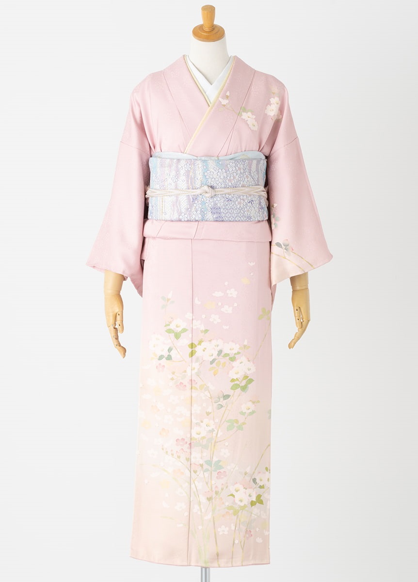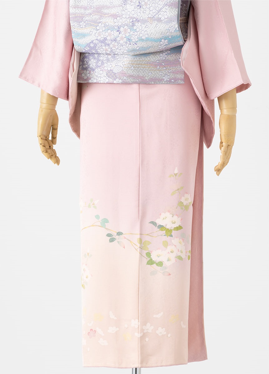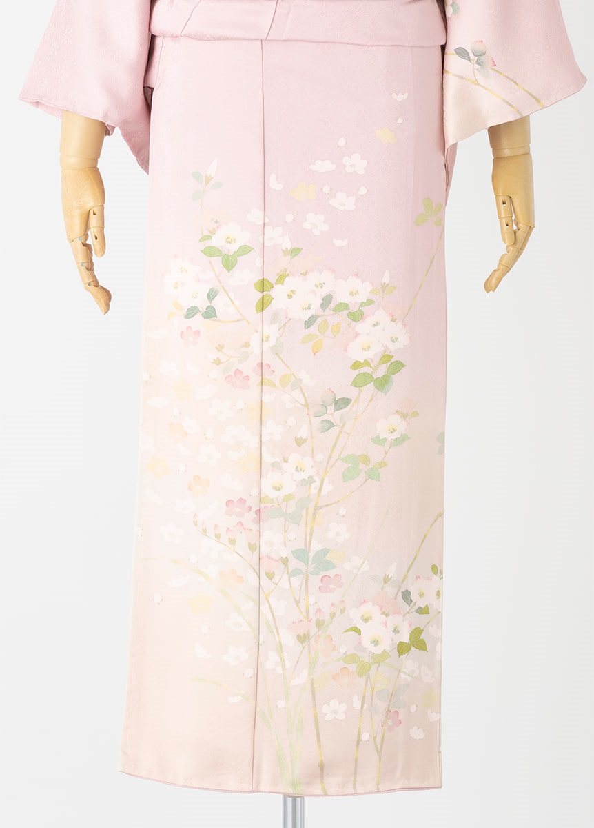 金彩などを使用せず、染のみで描いた優しい印象の訪問着です。たっぷりと描かれた花がお祝いの席を華やかに彩ります。