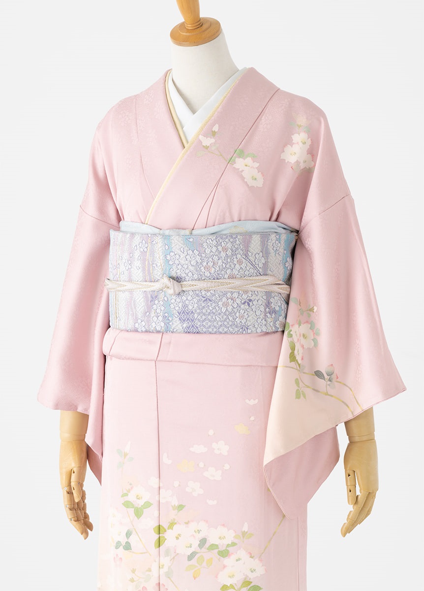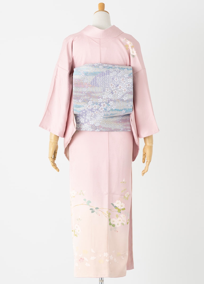桜が散りばめられた袋帯です。ぼかしに使われている水色と薄紫が、清涼感のあるコーディネートです。