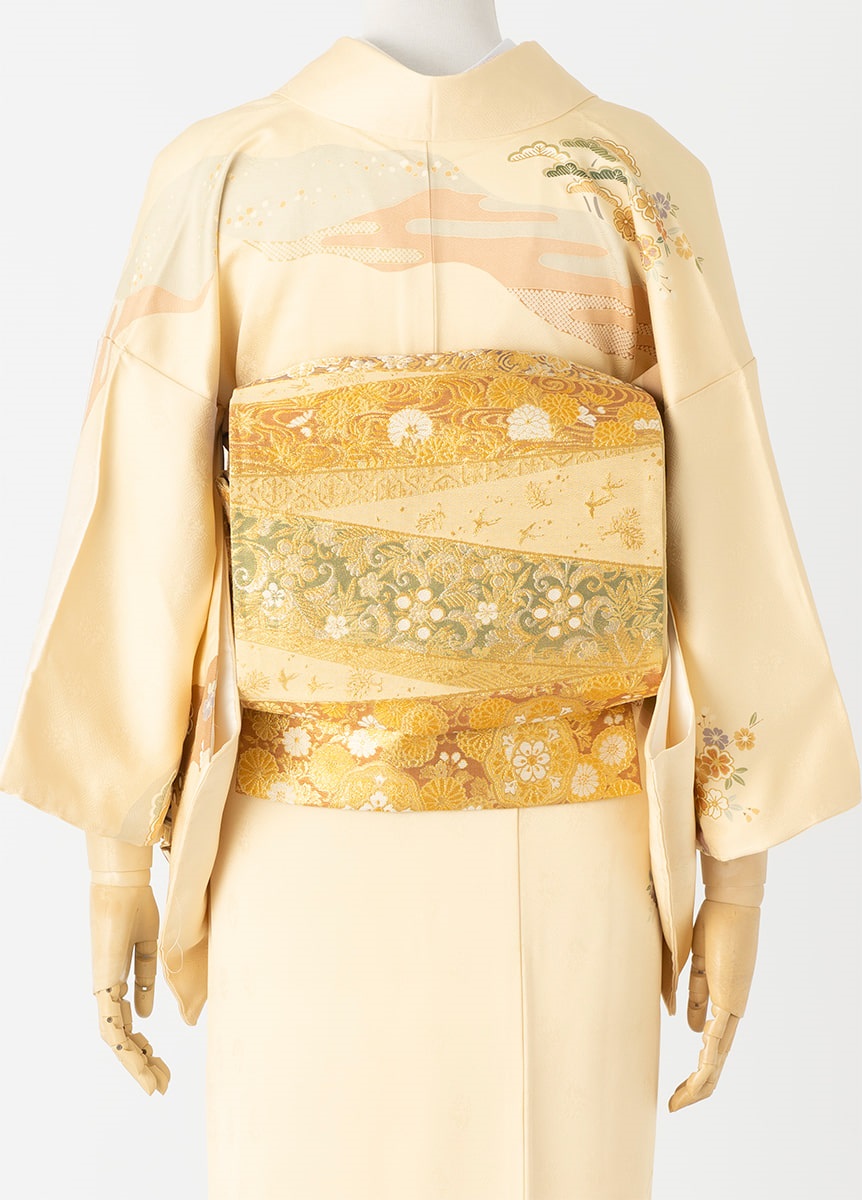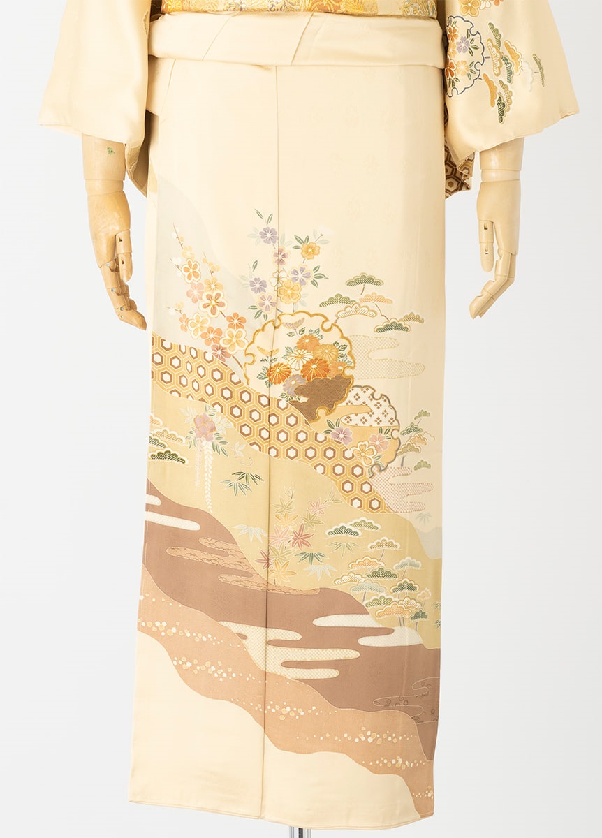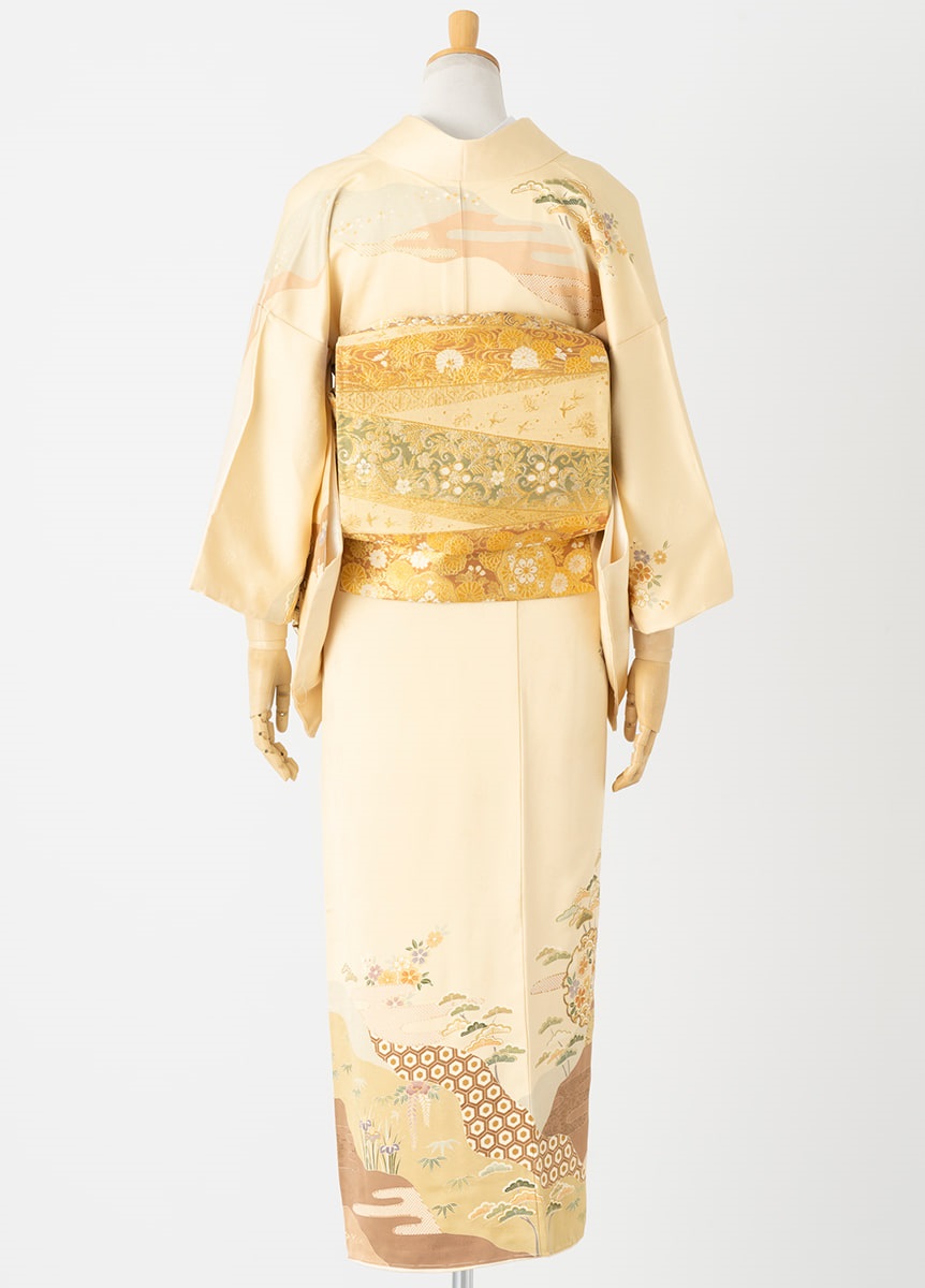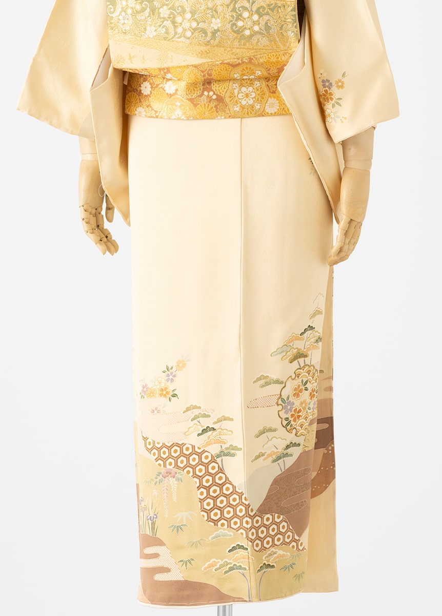 古典的な柄をたっぷりとデザインした訪問着です。柔らかな卵色の着物は年代を問わずにお召いただけます。
