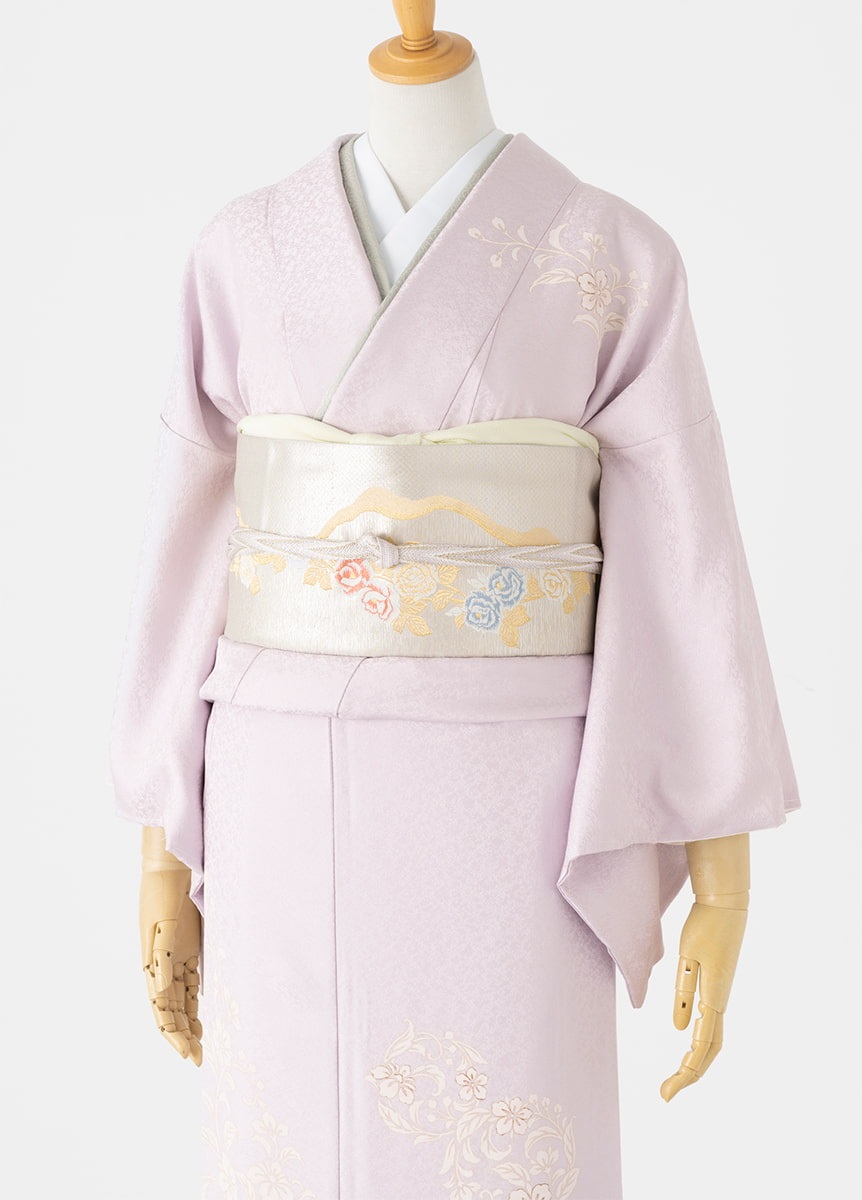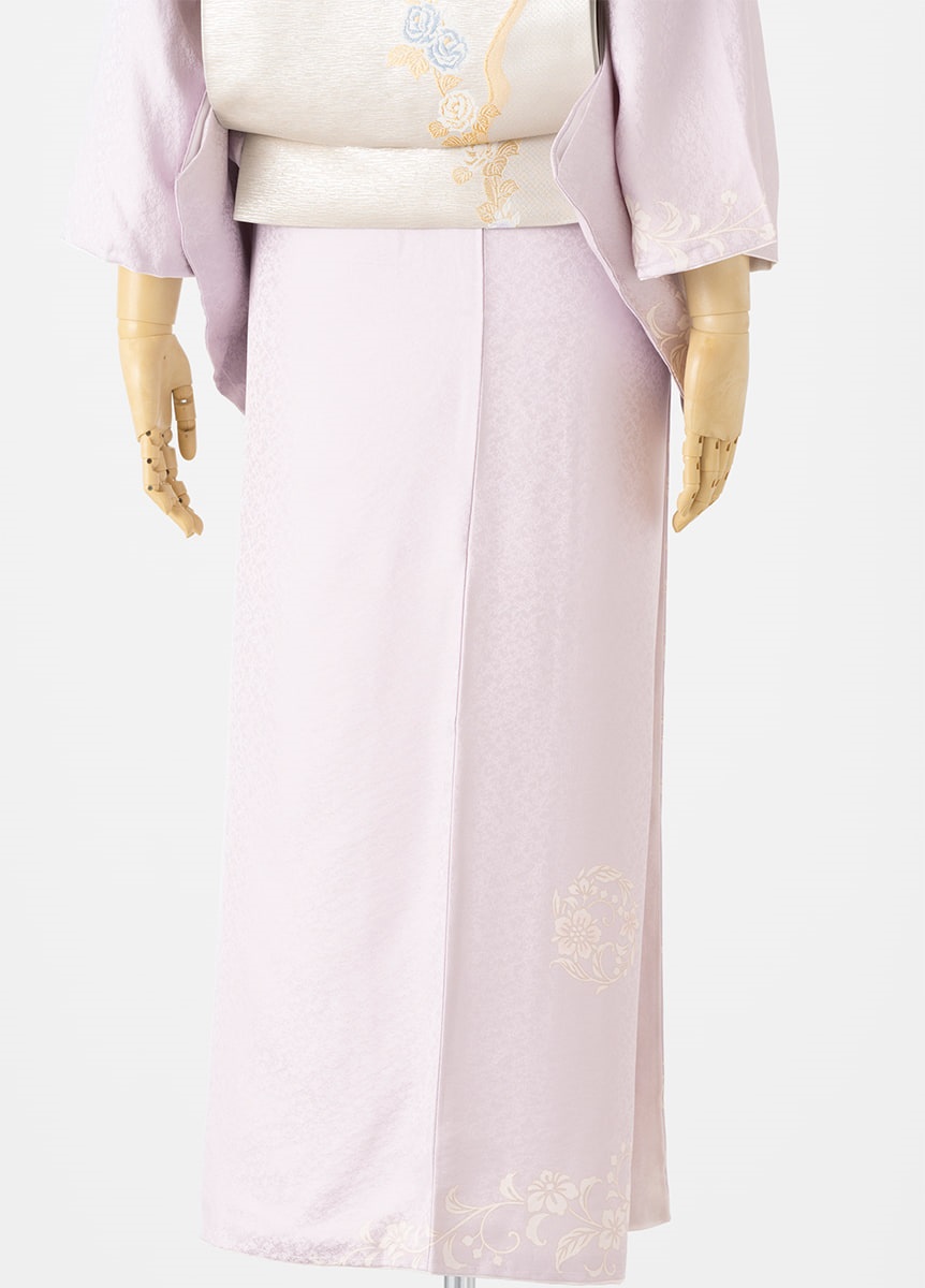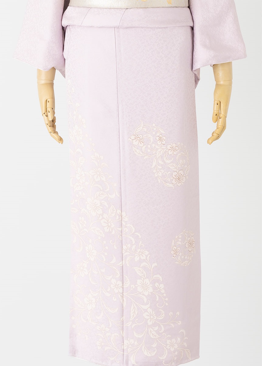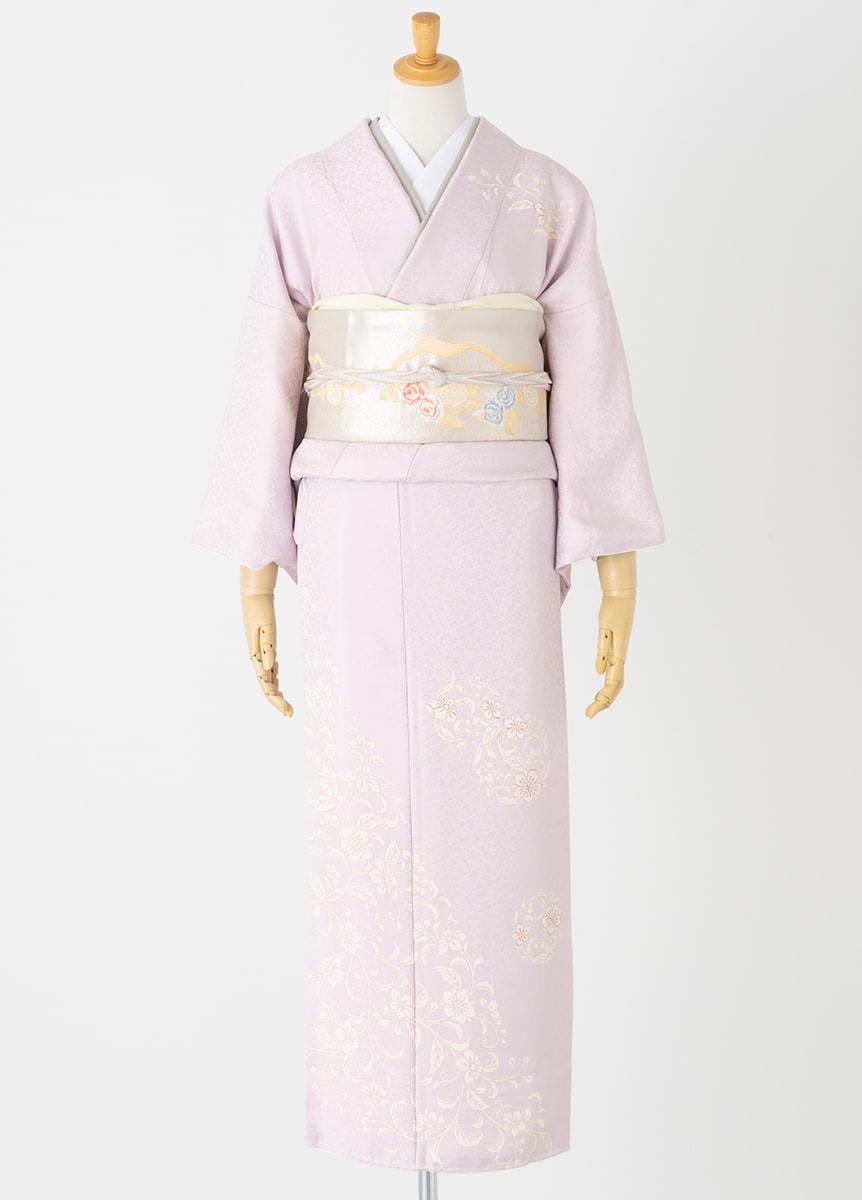上品な藤色に、唐草模様を白抜きでデザインした訪問着です。柄位置が低いため、ご身長が低めの方にもおすすめです。