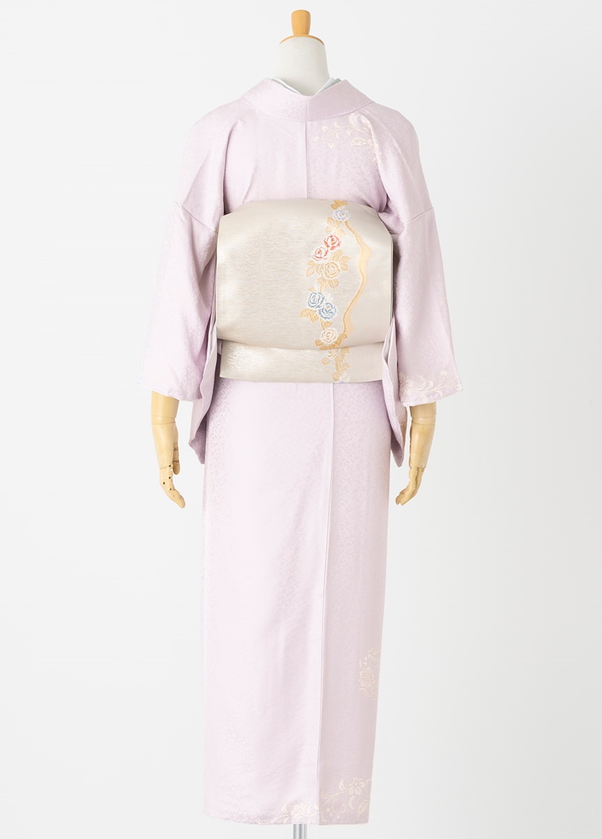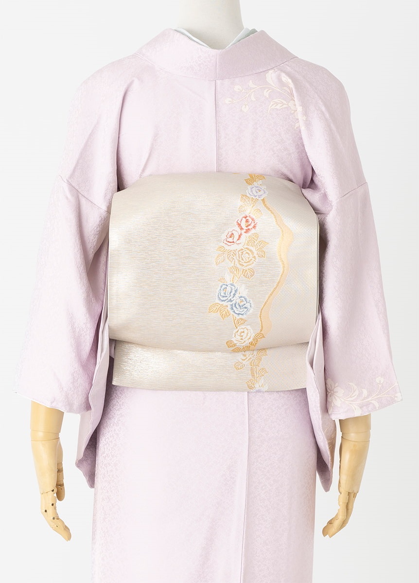 薔薇をデザインした袋帯です。お太鼓部分は縦柄のため、着姿をすっきり見せてくれます。