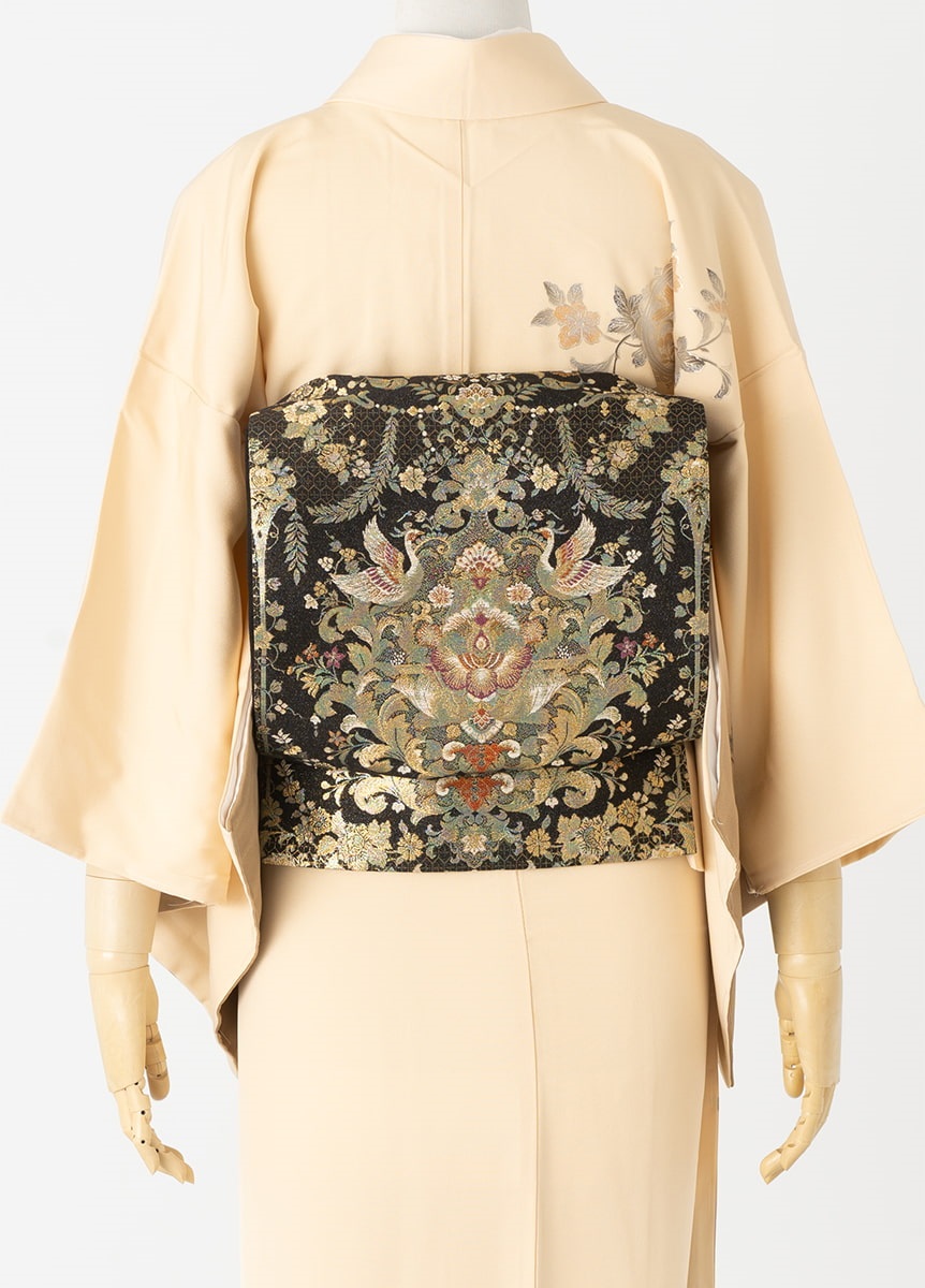 鳳凰がデザインされた異国情緒溢れる袋帯です。動物モチーフがお好きな方におすすめのコーディネートです。