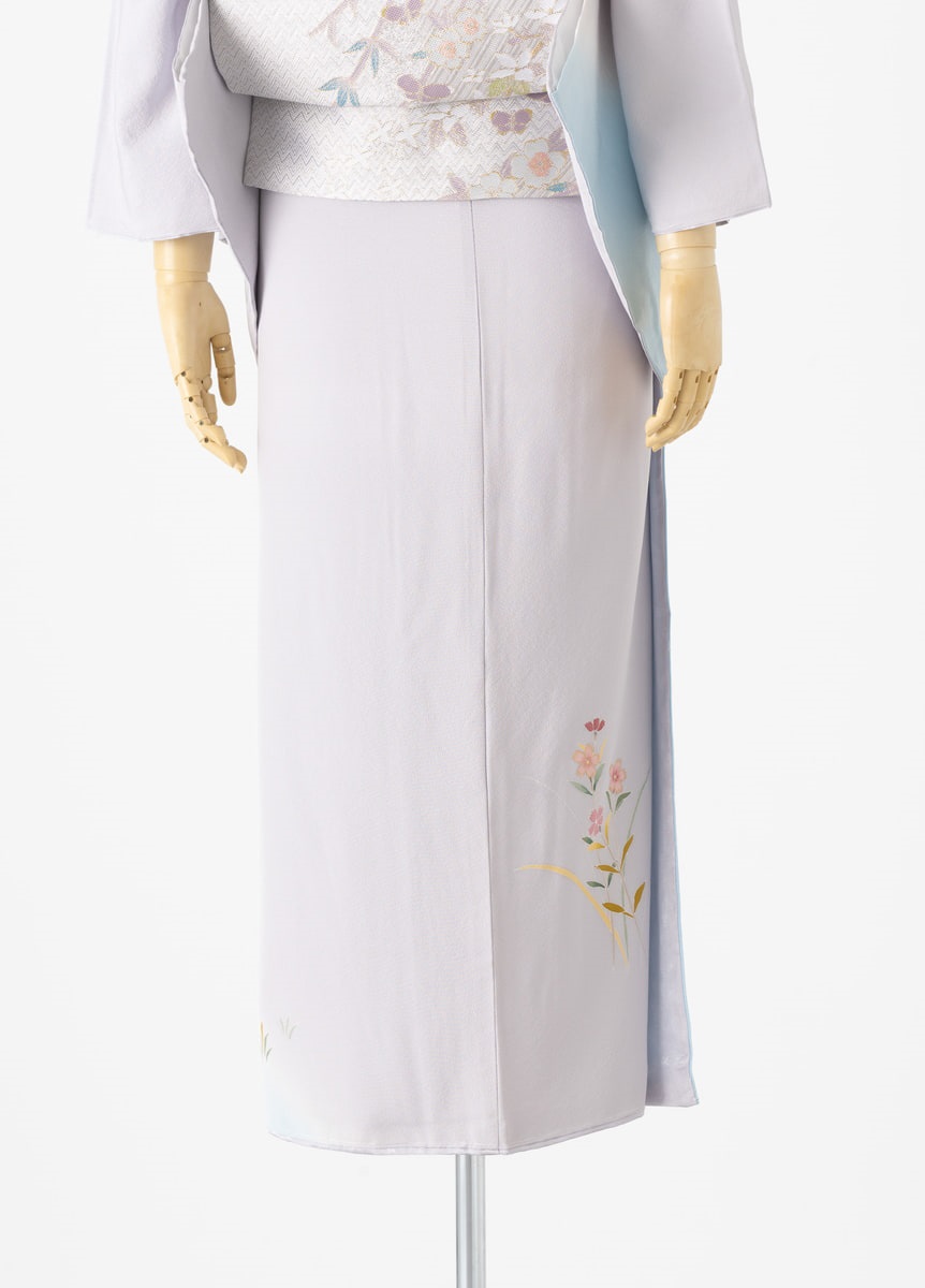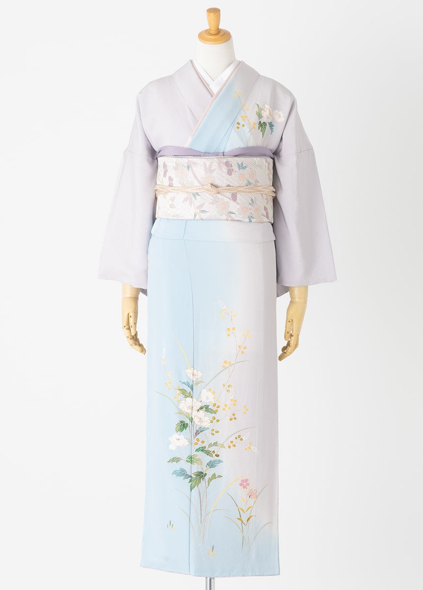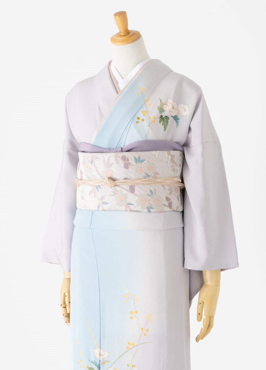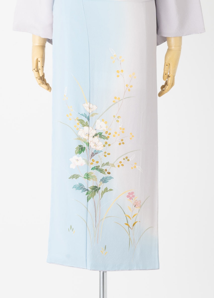 古典柄をモチーフとしており、結婚披露宴やパーティーなどのフォーマルな場面にお召いただけます。水色とグレーの染め分けが印象的な一枚。