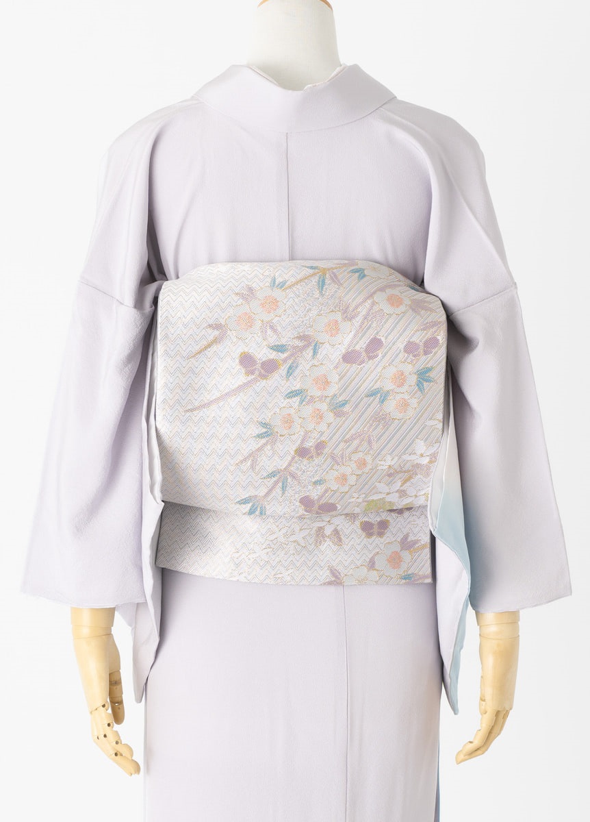 銀を基調とした花柄をデザインした袋帯です。片側に柄を寄せることで、お太鼓に無地の部分が出来るため、後ろ姿をすっきりと見せてくれます。