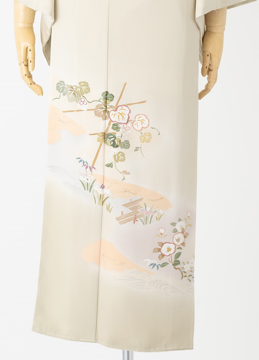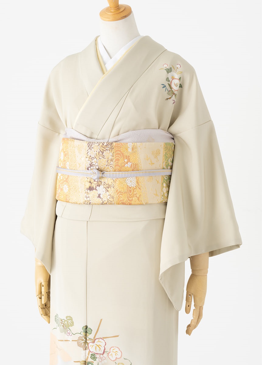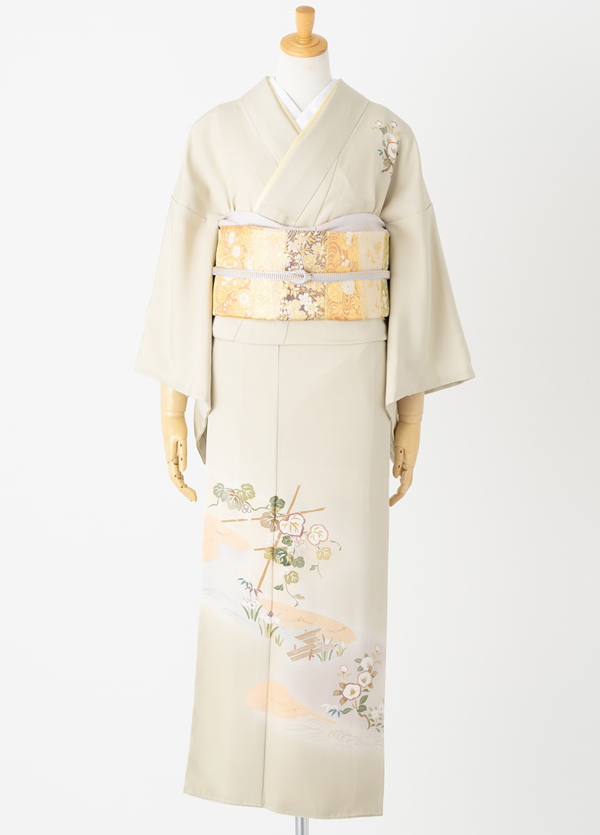 素材:【訪問着】正絹 【帯・小物】絹、ポリエステル、一部金属糸使用 【長襦袢】身頃/綿100% 裾・袖/ポリエステル100%