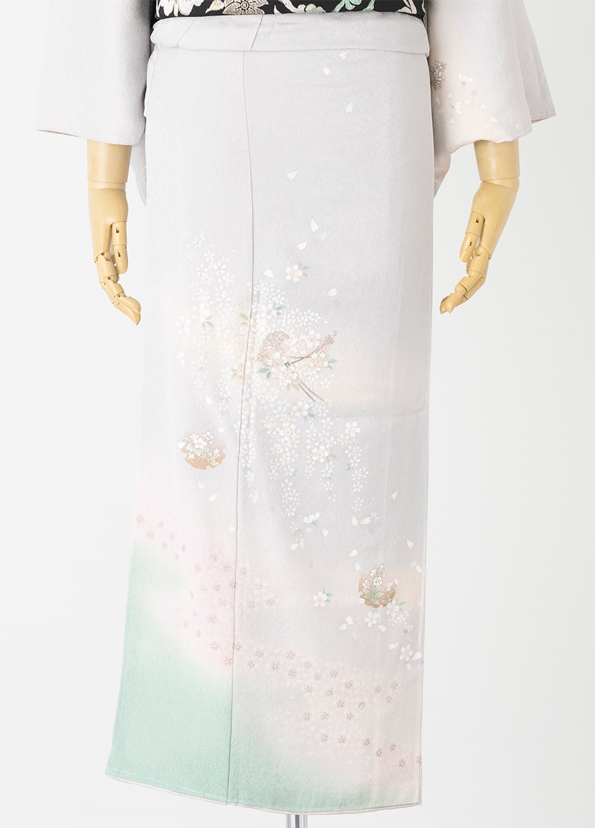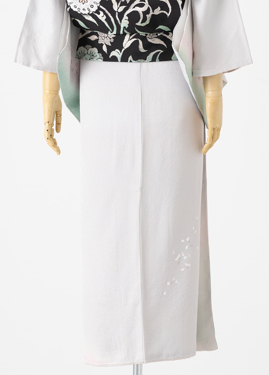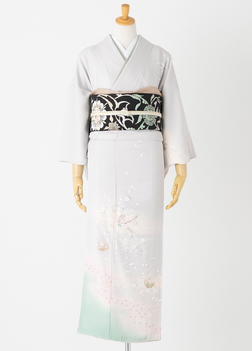 四季折々の花を集め「花日和」と名付けたフォーマルな着物です。スタイリッシュなグレーに可愛らしい小花をデザインしました。裾のミントグリーンのぼかしが印象的な一枚。
