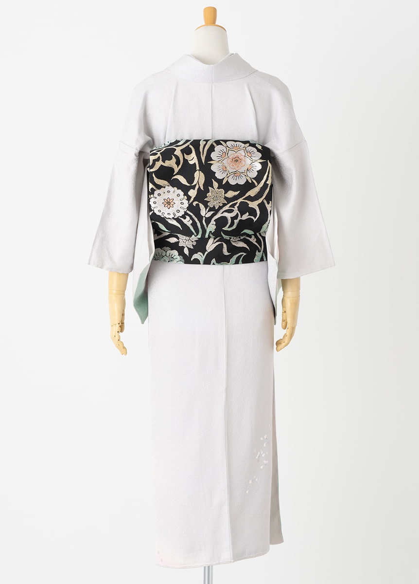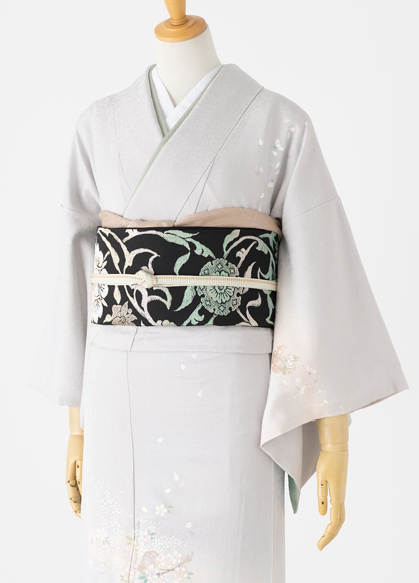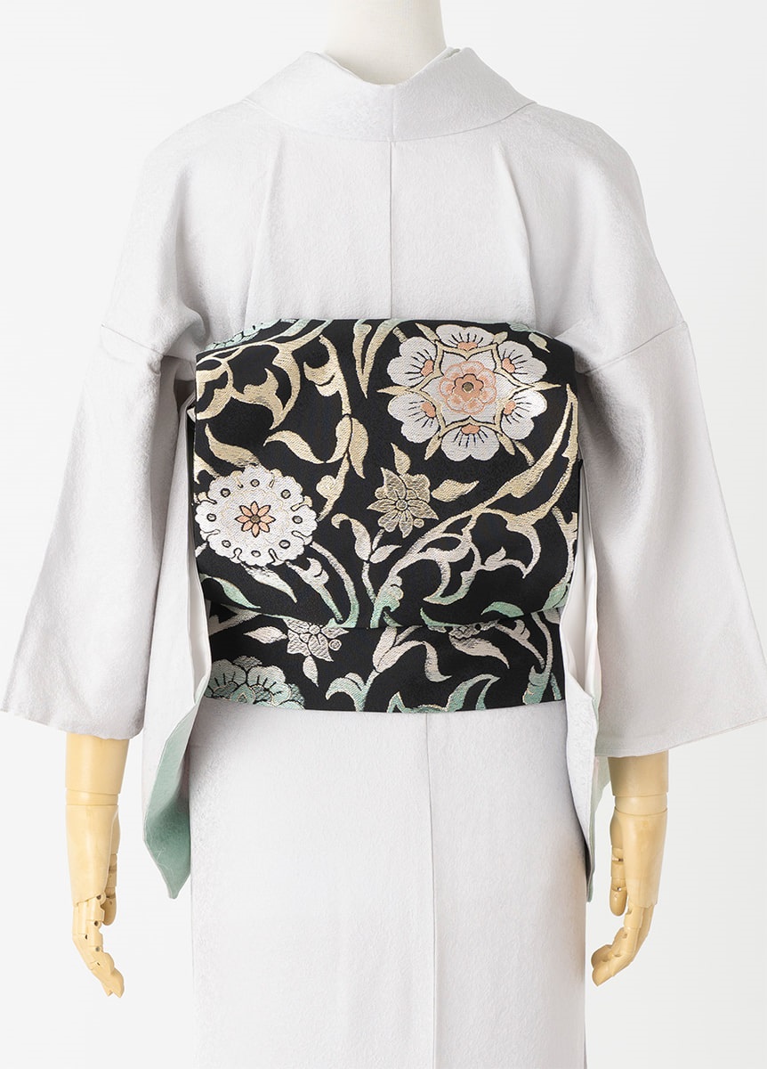 唐花を大胆にデザインした袋帯です。着物と同様にミントグリーンがアクセントになるコーディネートです。