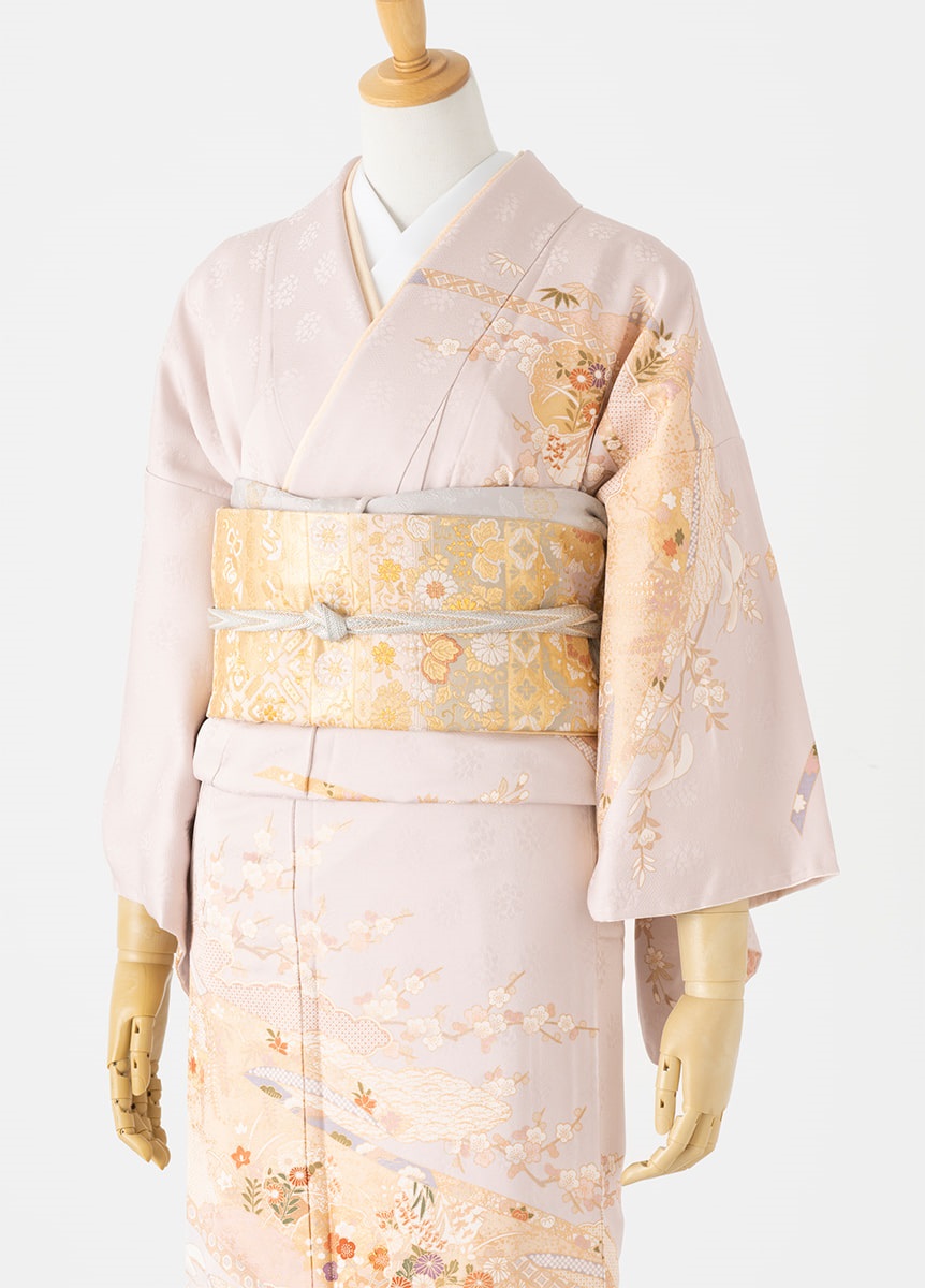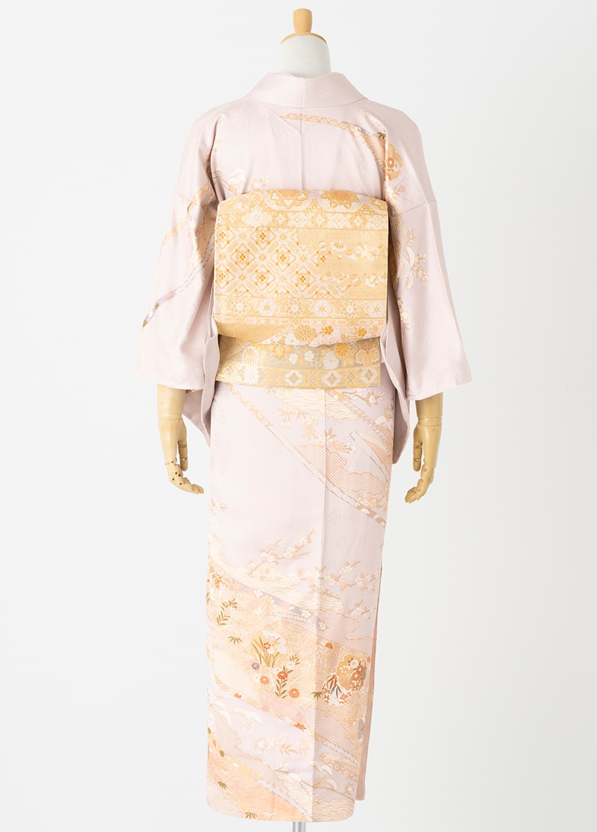 素材:【訪問着】正絹 【帯・小物】絹、ポリエステル、一部金属糸使用 【長襦袢】身頃/綿100% 裾・袖/ポリエステル100%