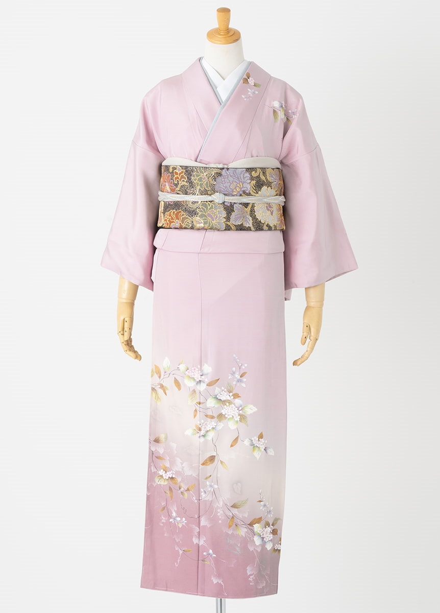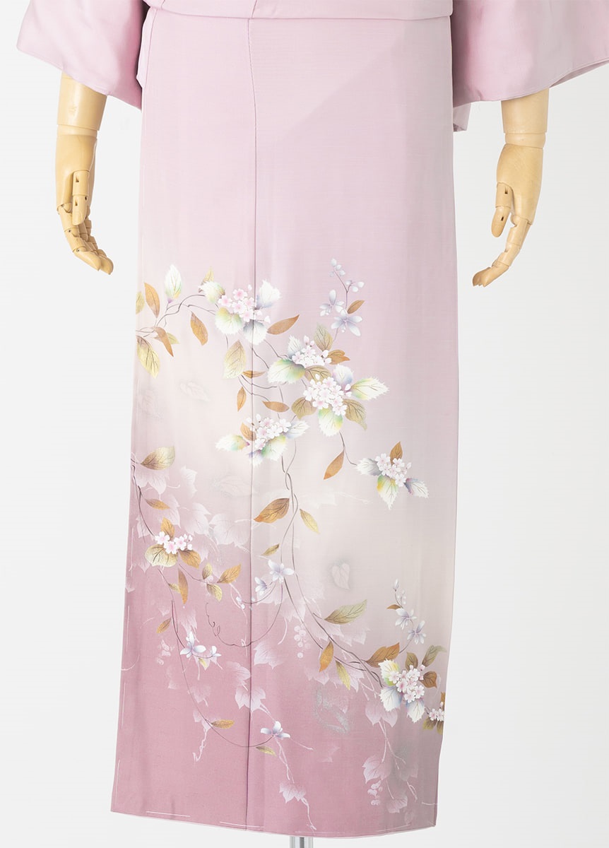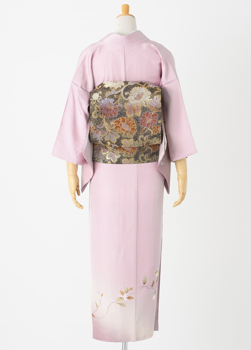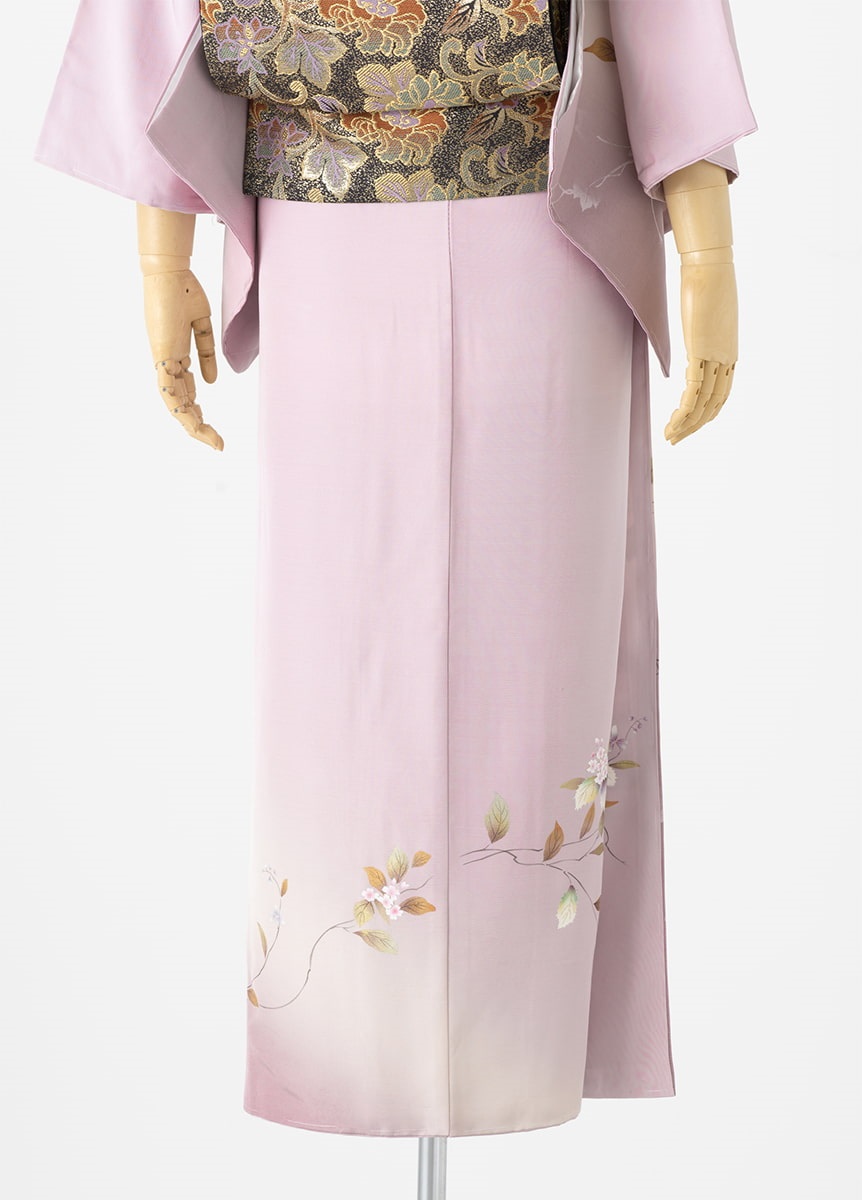 「和紙染」という和紙を使用した染めの技法で、葉の輪郭は和紙の繊維を活かして表現しています。優しいピンク色に白くぼかして描かれた葉のシルエットが、奥行きを感じさせます。