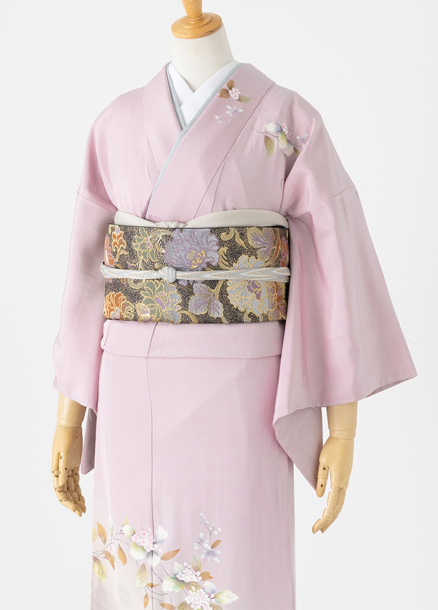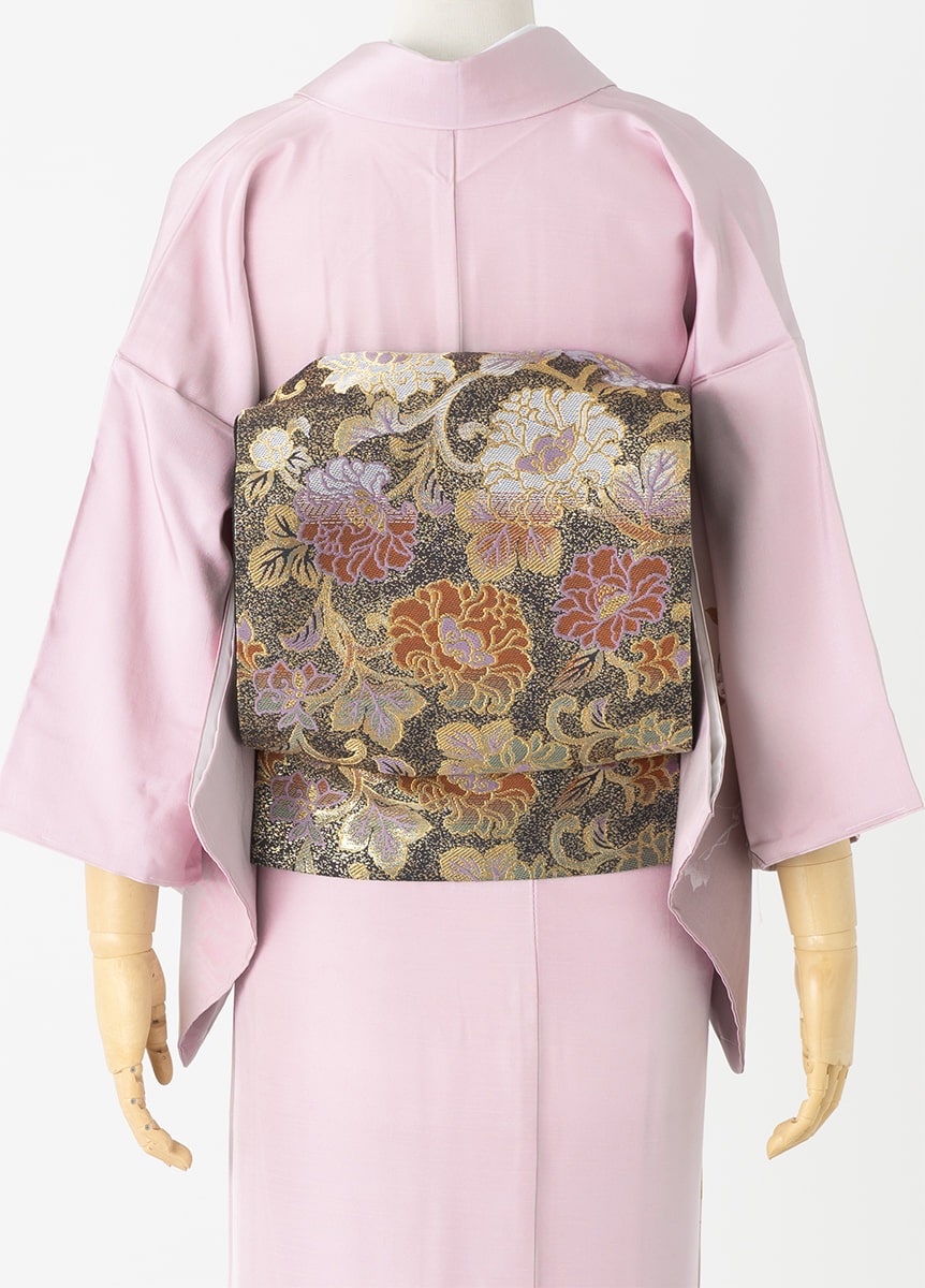 唐花を大胆にデザインした袋帯です。優しい雰囲気の着物に合わせることで、コーディネート全体を引き締めます。