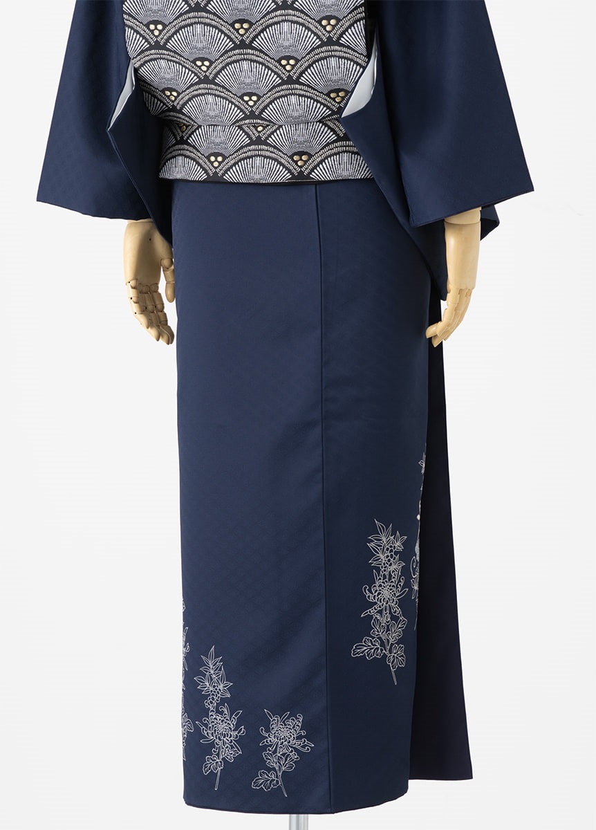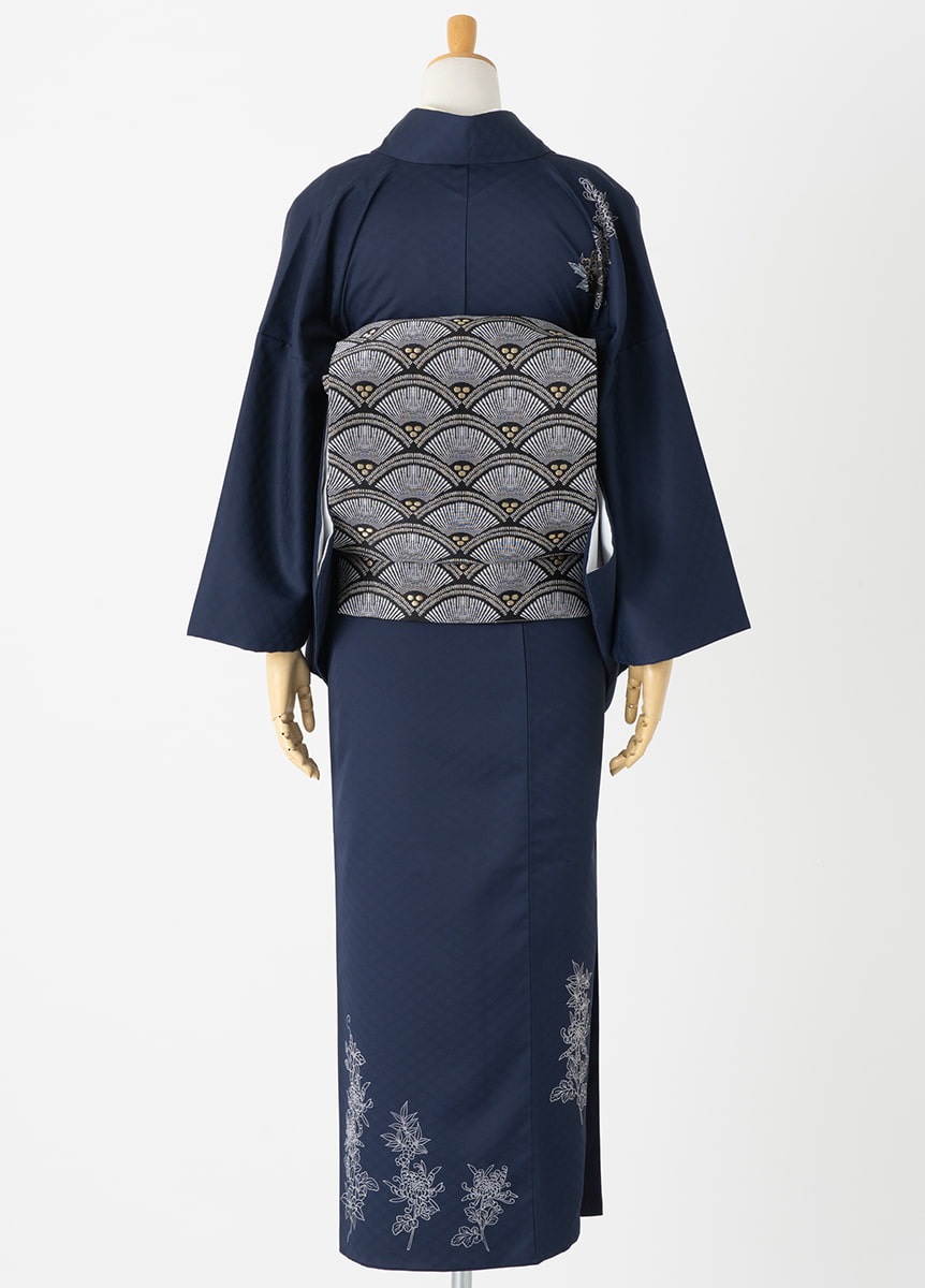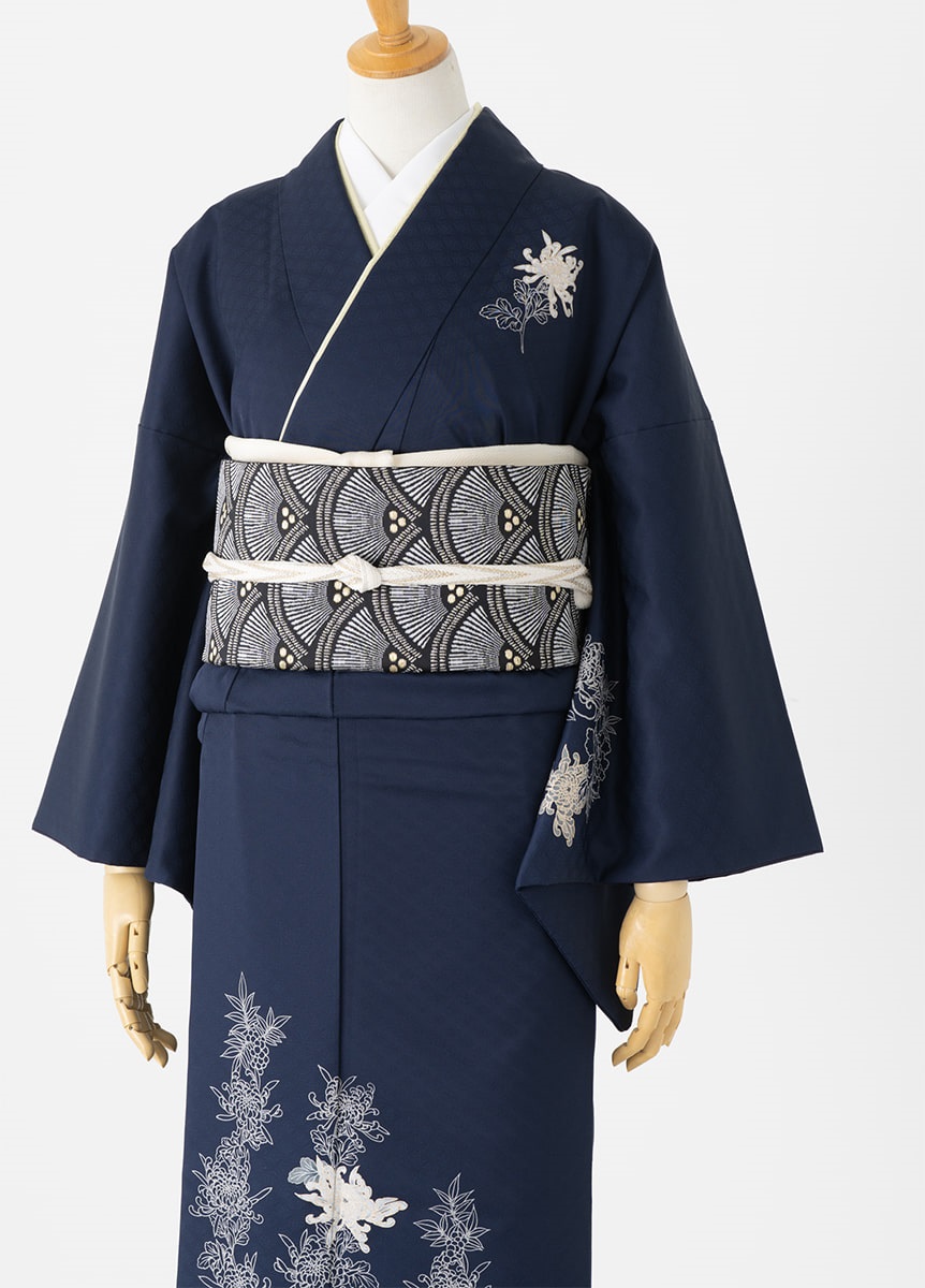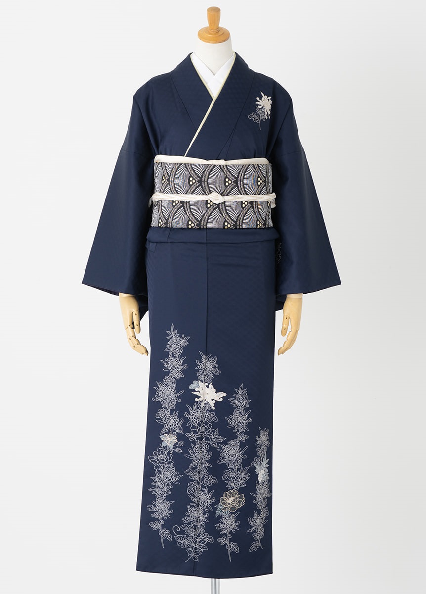 落ち着いた紺色の付下げ訪問着に、黒の袋帯を合わせたシックなスタイルです。かっこよく着こなしたい方におすすめ。