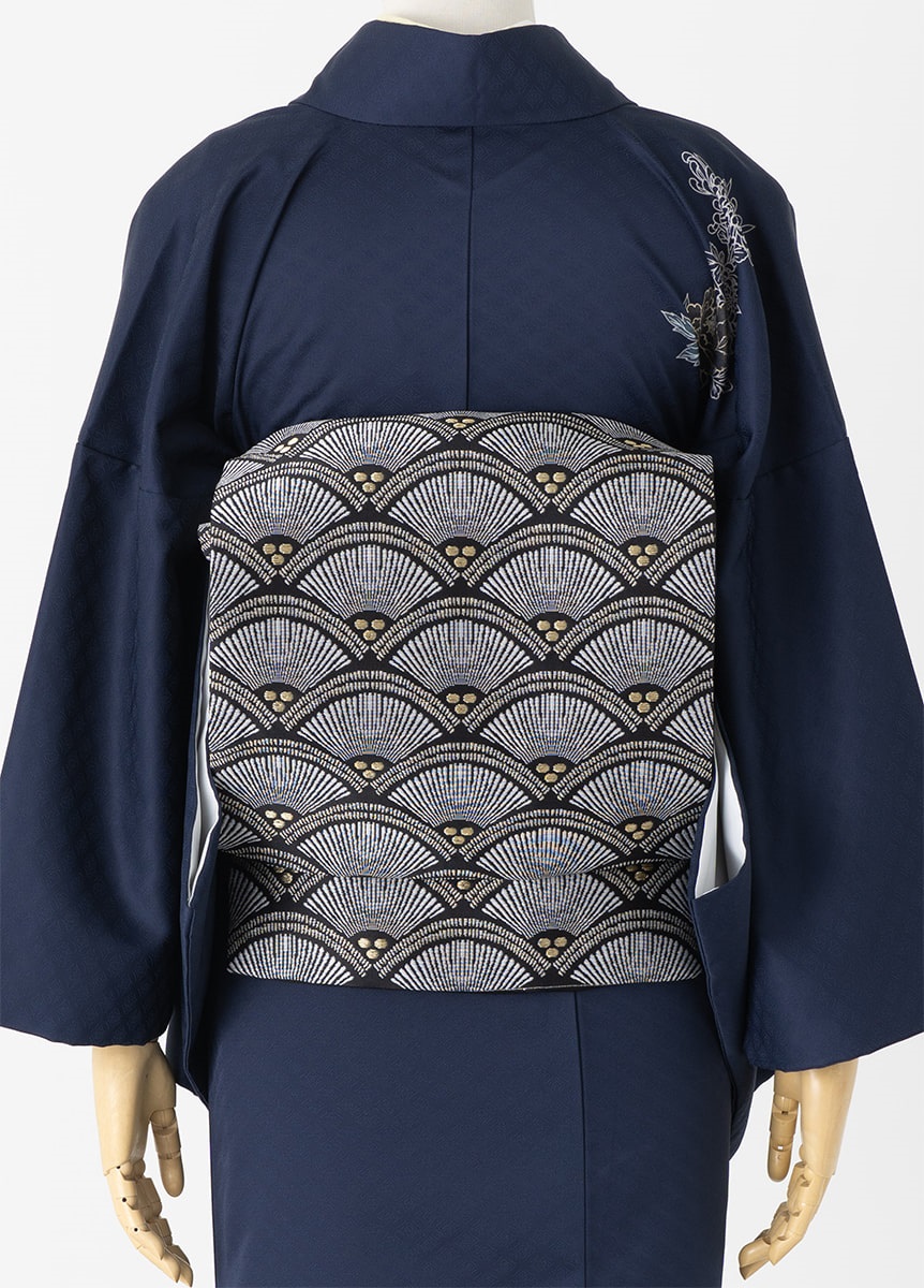 京都・西陣で織りあげた生地には、厳かかつ華やかな金銀糸(金属糸)を織り込み、永遠の幸福を願う吉祥文様である青海波と、長寿の意味合いを持つ松葉の文様を組み合わせたデザイン。古典柄でありながらスタイリッシュな印象で、カジュアルなパーティーにもなじみます。