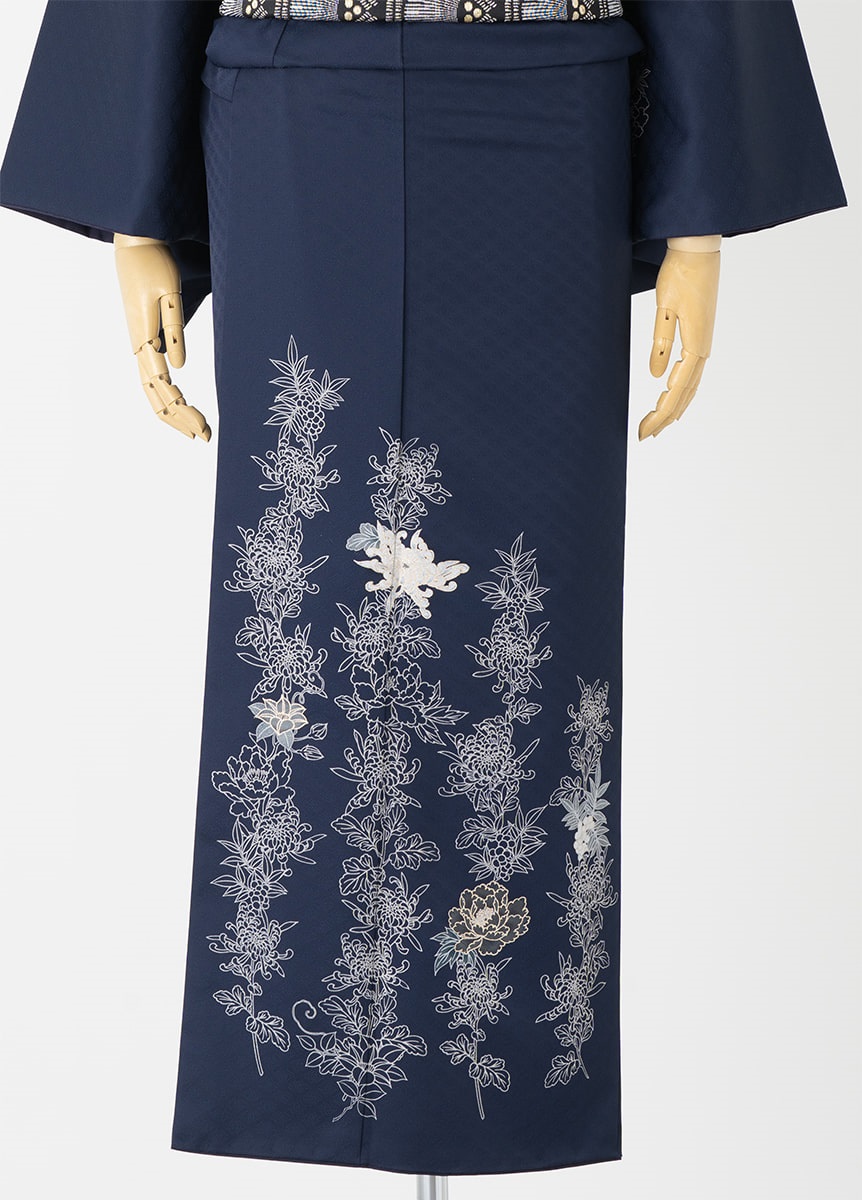 染めは京都で、絹と同等の染色技法で職人が丁寧に一反ずつ染め、全体の柄を「糸目上げ」という細かい線で表現し着た時にポイントとなる部分に一筆一筆彩色を施した手描き友禅です。四季折々の花(牡丹、鉄線、乱菊、南天)をたてに連なるようにすっきりと配したデザインが立ち姿も座り姿も凛と美しく引き立てます。